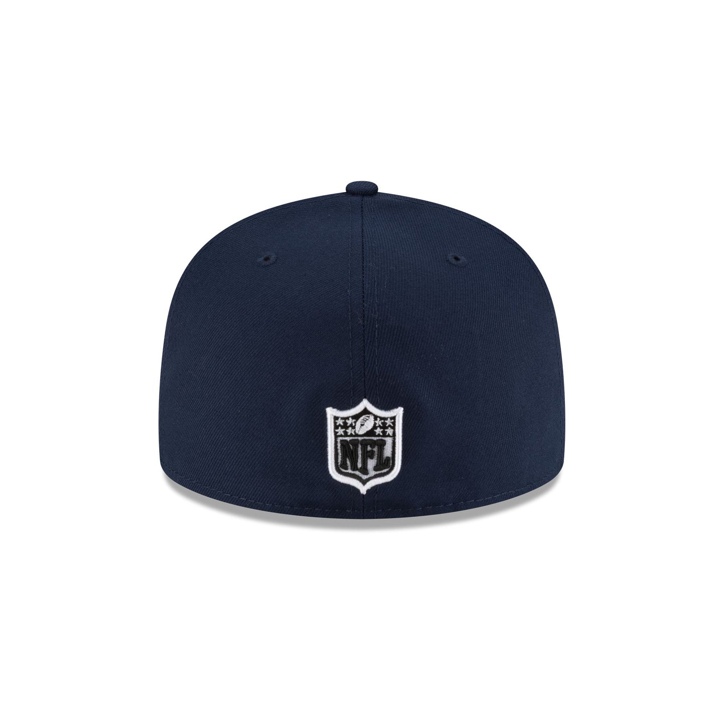 The Born x Raised x Dallas Cowboys Script 59FIFTY Fitted Cap features an embroidered Cowboys script wordmark with logo at the front panels and a Born x Raised logo at the right-wear side. Additional details include the NFL Shield logo at the rear and a gray undervisor.