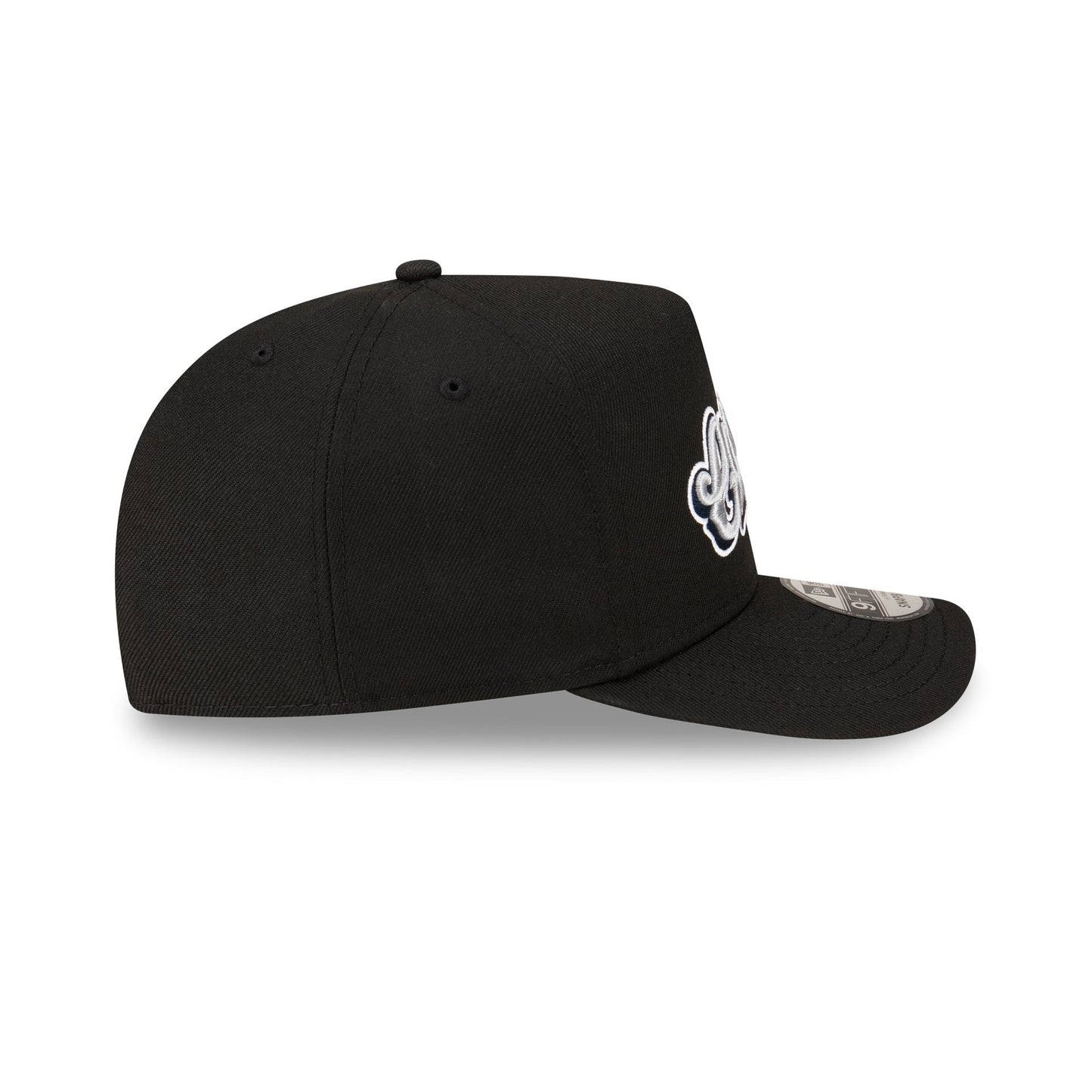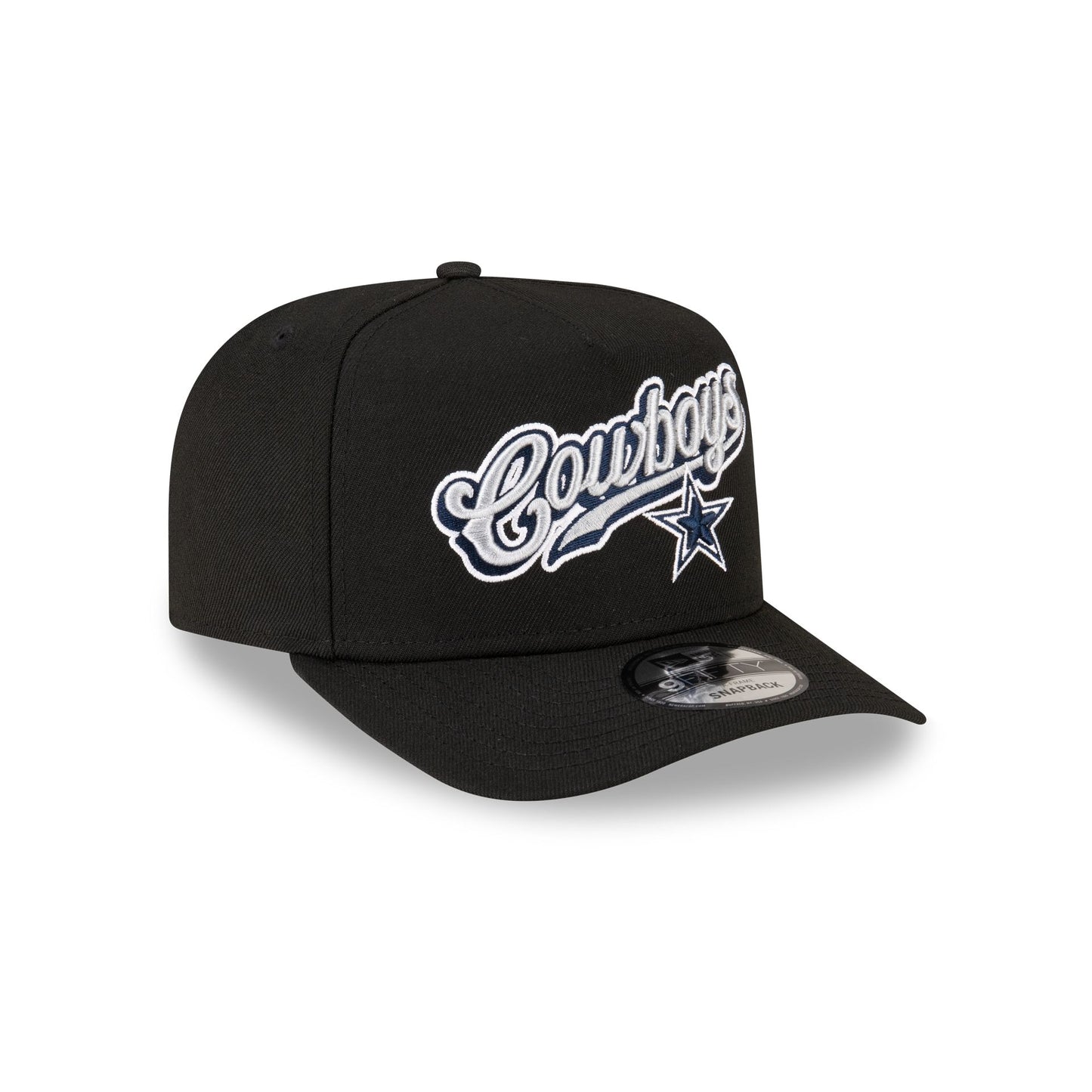 The Born x Raised x Dallas Cowboys Script Black 9FIFTY A-Frame Snapback features an embroidered Cowboys script wordmark with logo at the front panels and a Born x Raised logo above an adjustable snapback closure at the rear. Additional details include a pre-curved visor and a green undervisor.