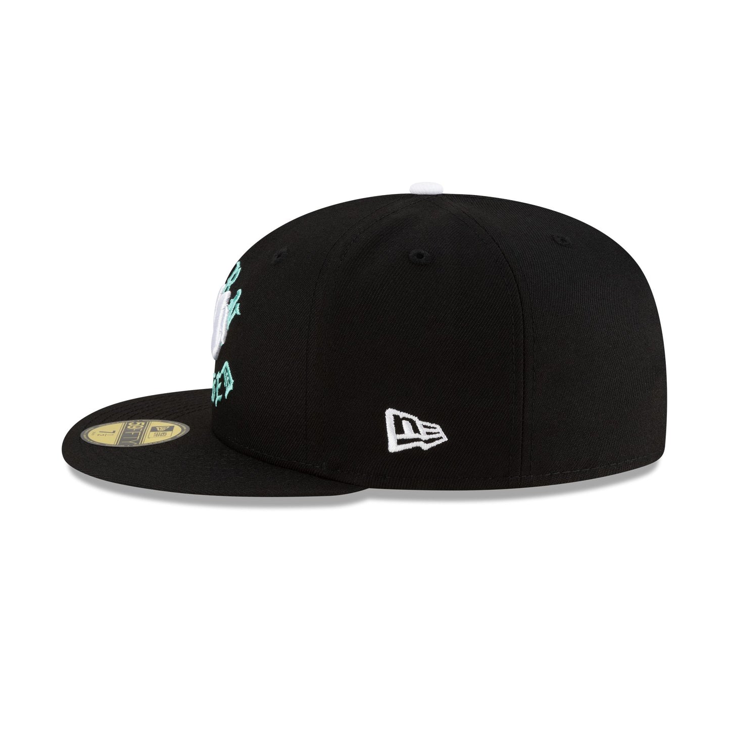 The Born x Raised x Diablos Rojos del México Black 59FIFTY Fitted Cap features an embroidered Diablos Rojos Born x Raised logo at the front panels with a LMB 100th Anniversary logo at the rear and a mint blue undervisor.
