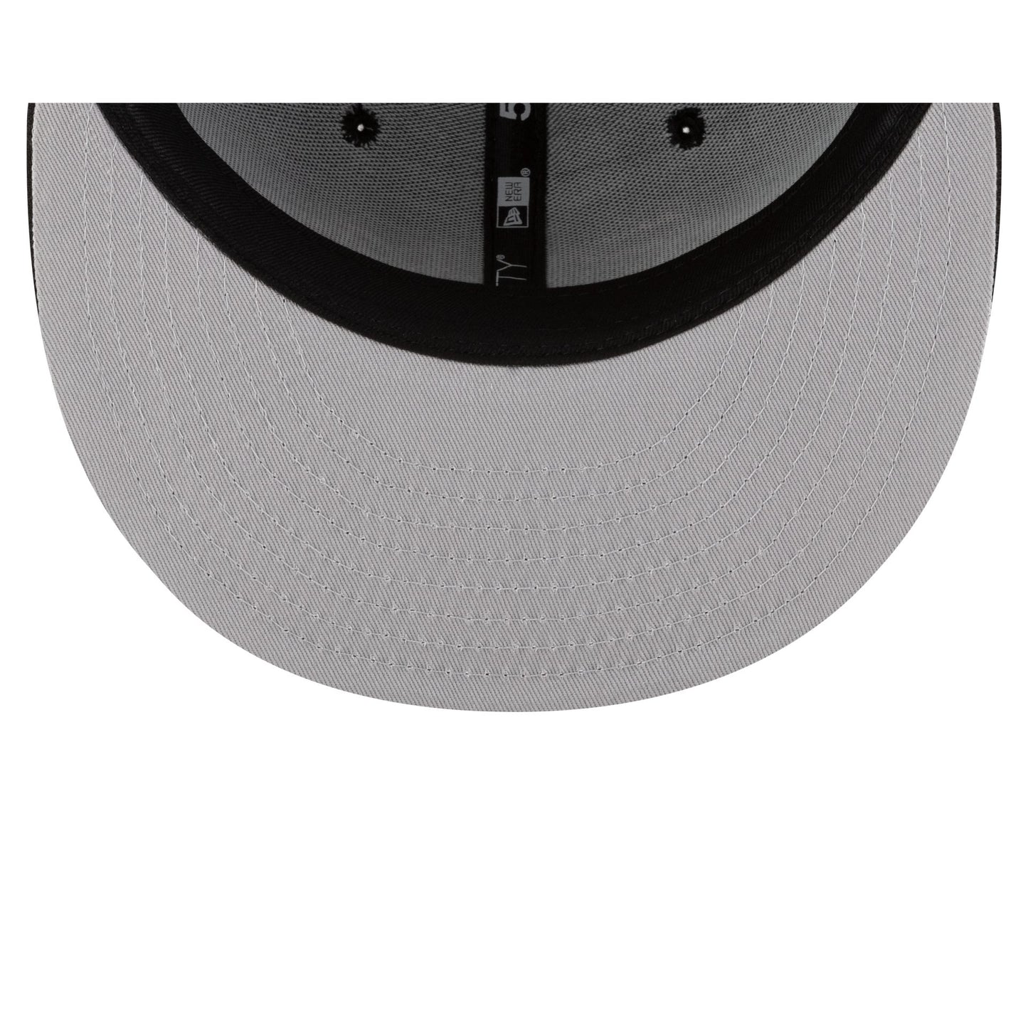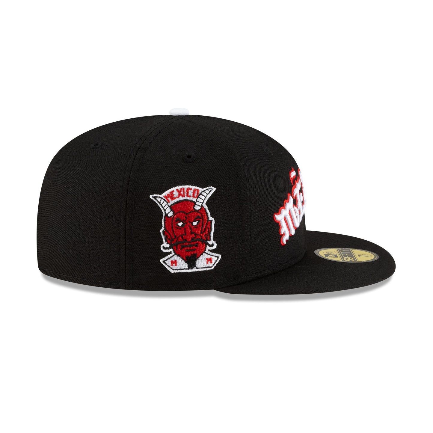 The Born x Raised x Diablos Rojos del México Sidepatch 59FIFTY Fitted Cap features an embroidered Diablos Rojos México wordmark at the front panels with a logo at the right-wear side. Additional details include a LMB 100th Anniversary logo at the rear and a gray undervisor.