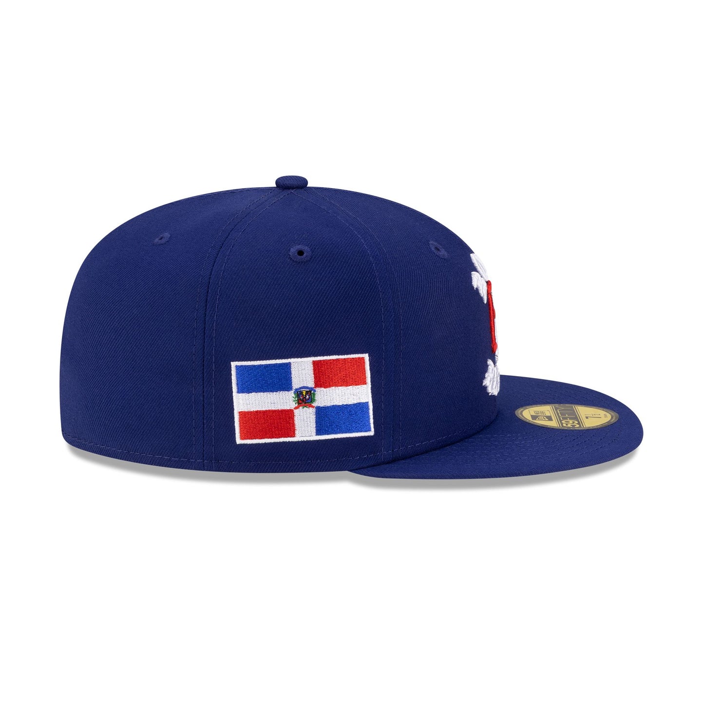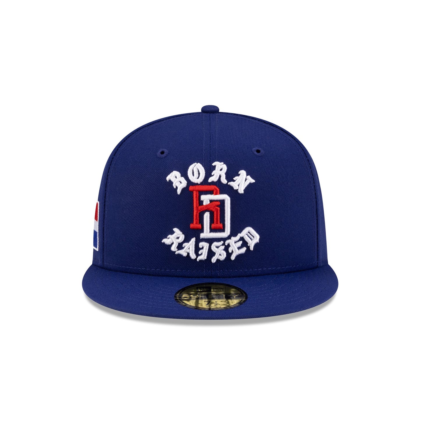 The Born x Raised x Dominican Republic Blue 59FIFTY Fitted Cap features an embroidered Born x Raised Dominican Republic logo at the front panels with a World Baseball Classic logo at the rear. Additional details include a Dominican Republic flag at the right-wear side with a New Era Flag at the left-wear side and a gray undervisor.