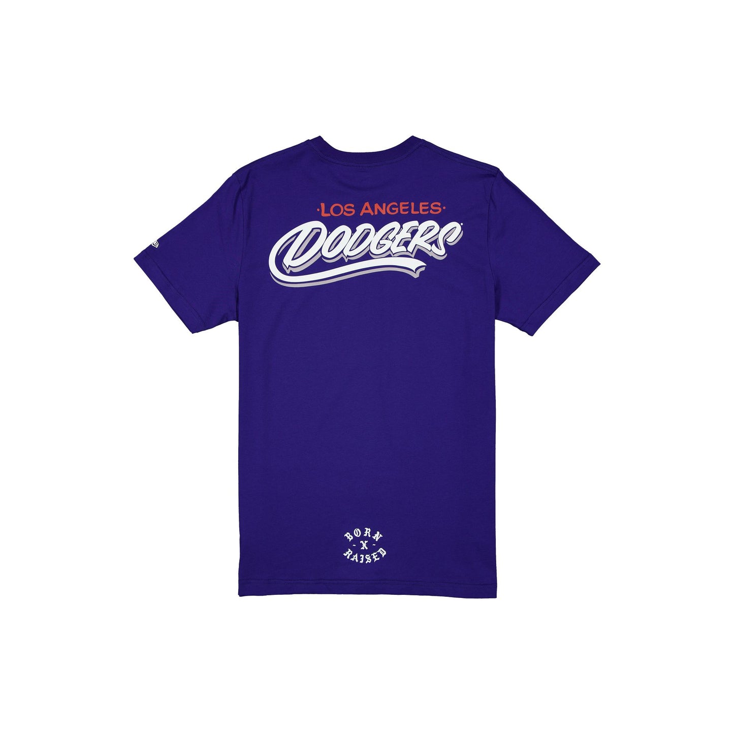 The Born x Raised x Los Angeles Dodgers Basic Blue T-Shirt features a screen-printed Dodgers logo at the left chest and graphic at the rear.