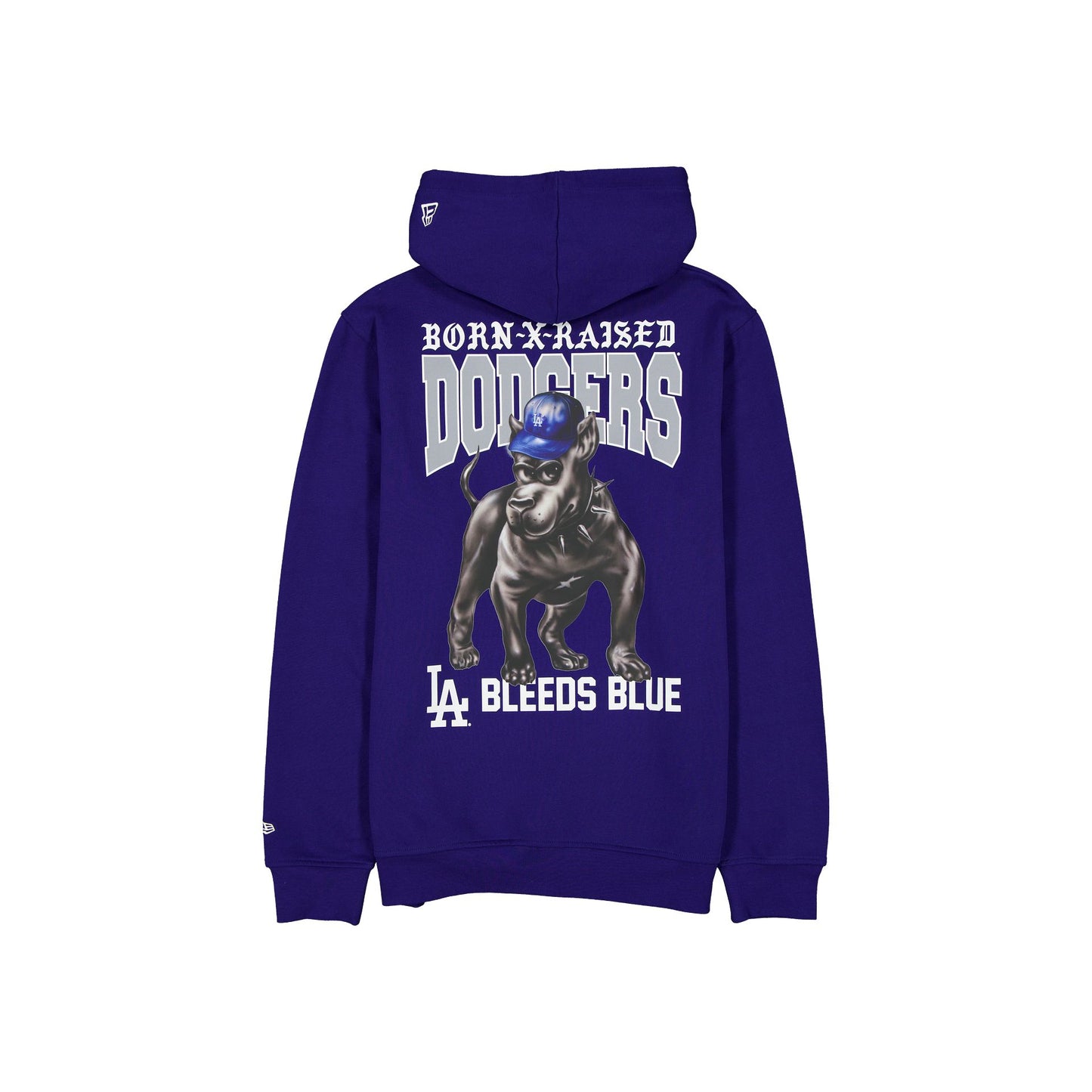 The Born x Raised x Los Angeles Dodgers Bleeds Blue Hoodie features a screen-printed Dodgers logo at the left chest with a graphic at the rear. Additional details include kangaroo pockets an adjustable drawstring at the hood.