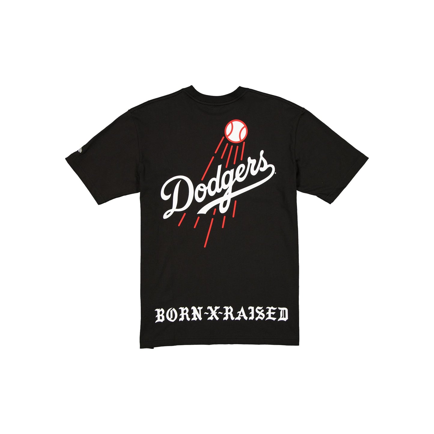 The Born x Raised x Los Angeles Dodgers Fly Ball Black T-Shirt features a screen-printed Dodgers Born x Raised graphic at the front and rear.
