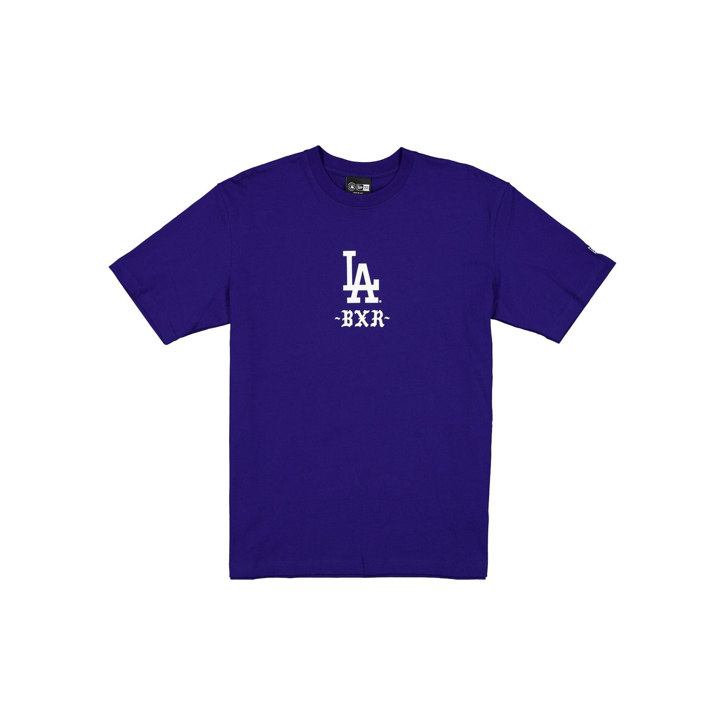 The Born x Raised x Los Angeles Dodgers Fly Ball Blue T-Shirt features a screen-printed Dodgers Born x Raised graphic at the front and rear.