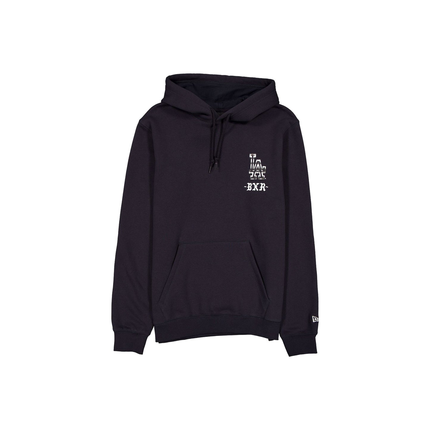 The Born x Raised x Los Angeles Dodgers Low Rider Navy Hoodie features a screen-printed Dodgers Born x Raised logo at the front and a car graphic at the rear. Additional details include kangaroo pockets and adjustable drawstrings at the hood.