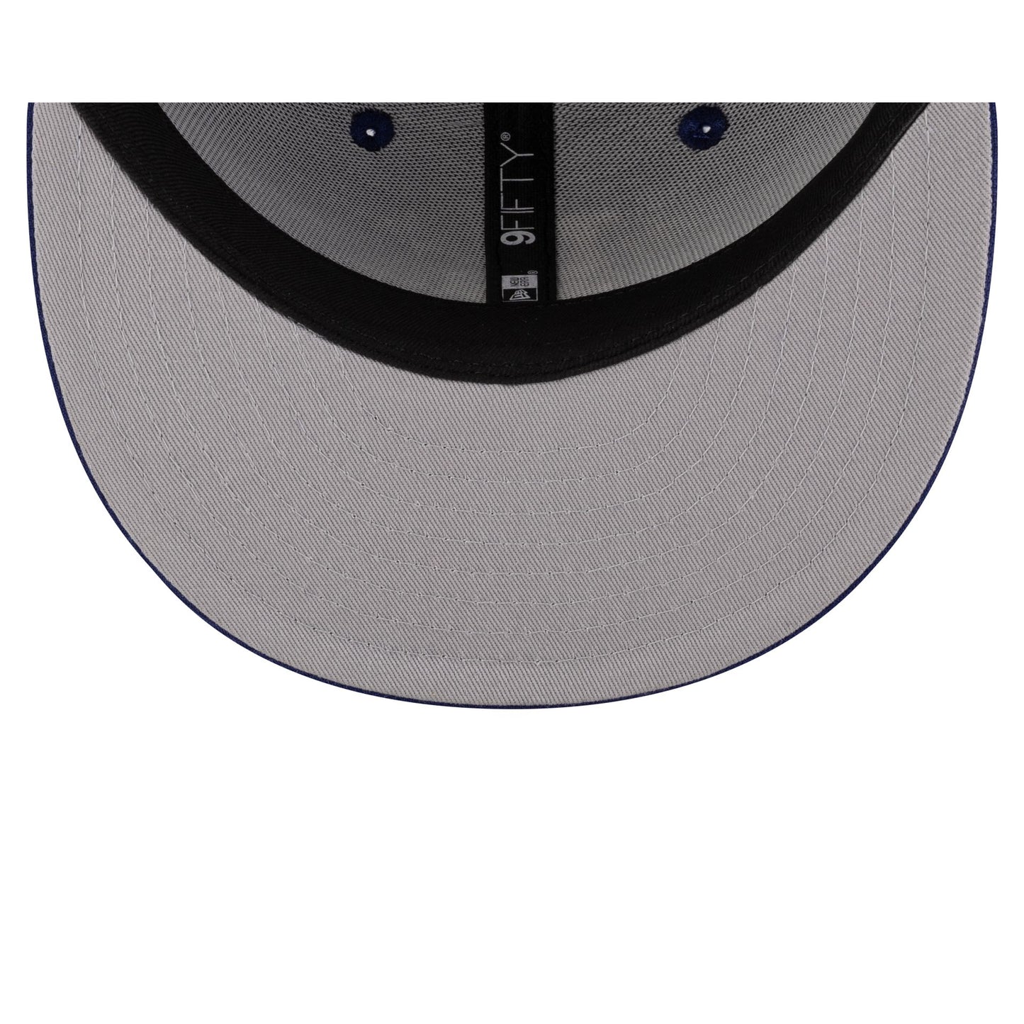 The Born x Raised x Los Angeles Dodgers World Series Champions Kids 9FIFTY Snapback features an embroidered Dodgers Born x Raised logo at the front panels with 2024 World Series Champions patch at the right-wear side. Additional details include a snapback closure at the rear and a gray undervisor.