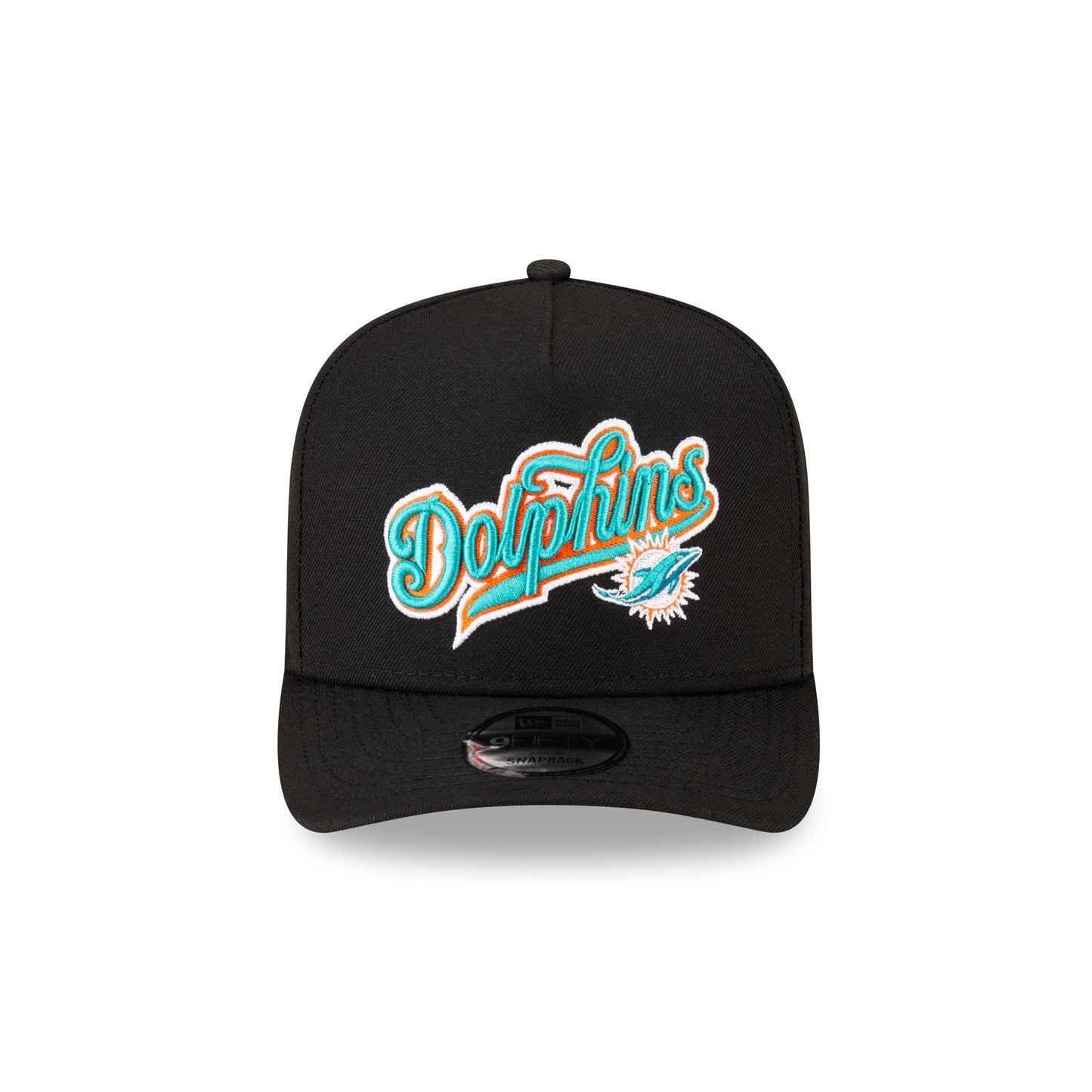 The Born x Raised x Miami Dolphins Script Black 9FIFTY A-Frame Snapback features an embroidered Dolphins script wordmark with logo at the front panels and a Born x Raised logo above an adjustable snapback closure at the rear. Additional details include a pre-curved visor and a green undervisor.