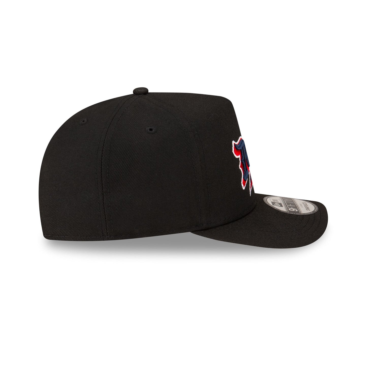 The Born x Raised x New England Patriots Script Black 9FIFTY A-Frame Snapback features an embroidered Patriots script wordmark with logo at the front panels and a Born x Raised logo above an adjustable snapback closure at the rear. Additional details include a pre-curved visor and a green undervisor.
