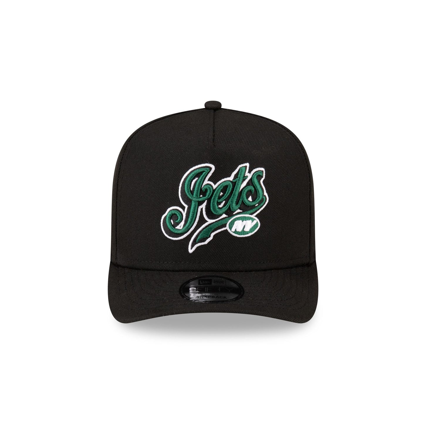 The Born x Raised x New York Jets Script Black 9FIFTY A-Frame Snapback features an embroidered Jets script wordmark with logo at the front panels and a Born x Raised logo above an adjustable snapback closure at the rear. Additional details include a pre-curved visor and a green undervisor.