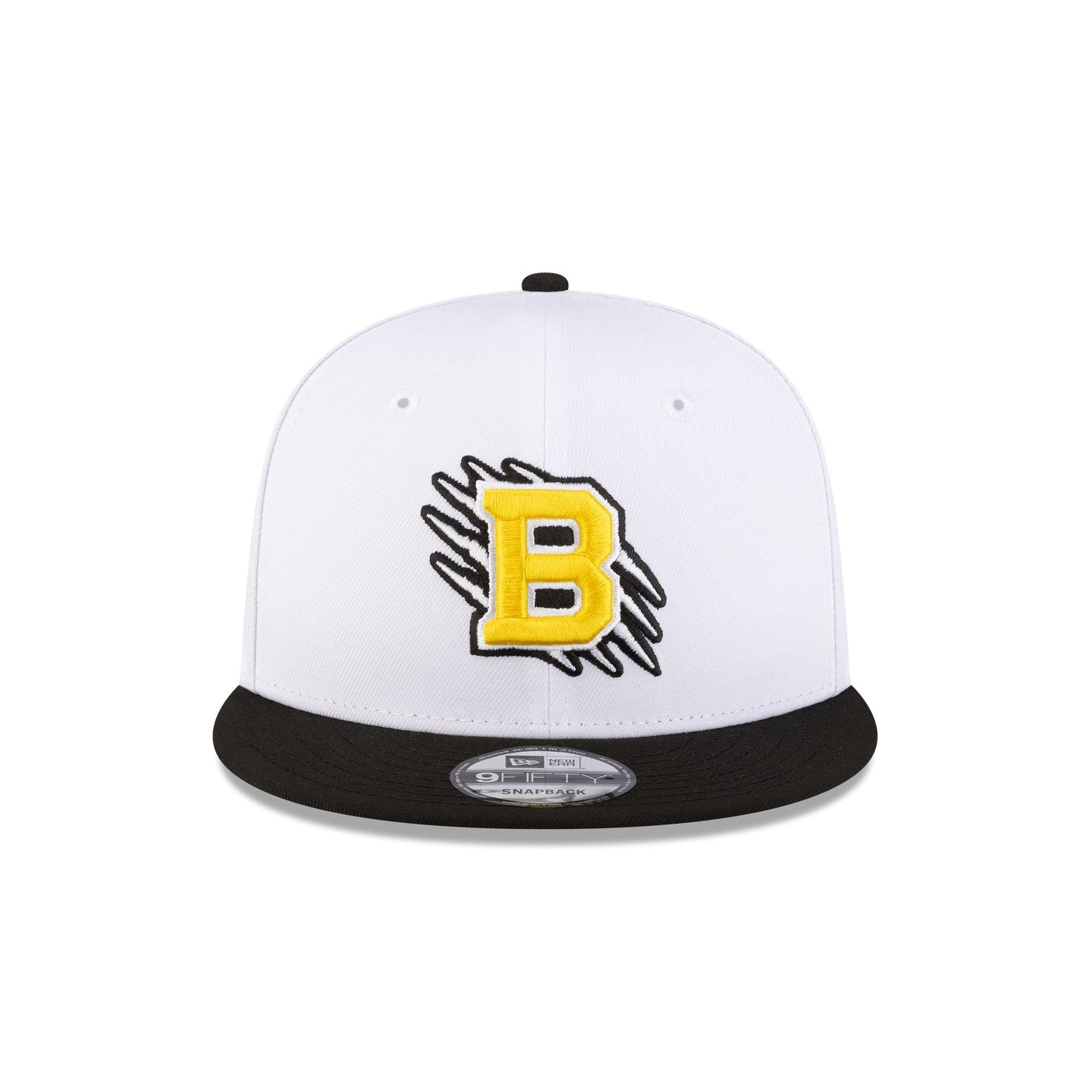 The Boston Bruins 2026 Stadium Series 9FIFTY Snapback features an embroidered Bruins scratch logo at the front panels with a 2026 Stadium Series patch at the right-wear side. Additional details include an adjustable snapback closure at the rear and a gray undervisor.