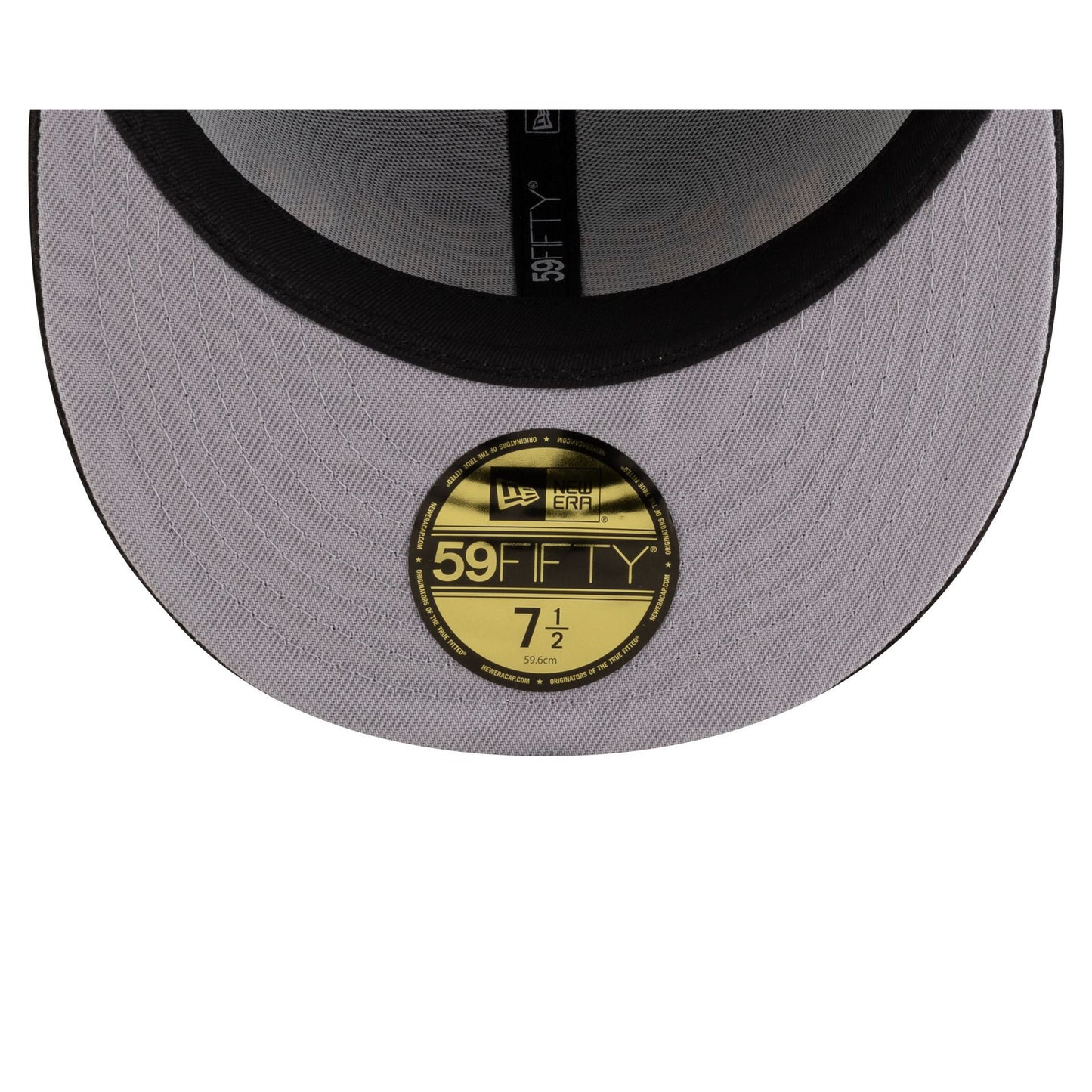The Boston Bruins Black Cord 59FIFTY Fitted Cap features an embroidered Bruins wordmark at the front panels with a matching NHL Shield at the rear. Additional details include a 90th Anniversary patch at the right-wear side and a gray undervisor.
