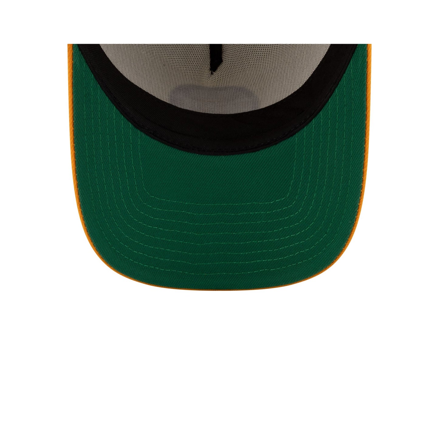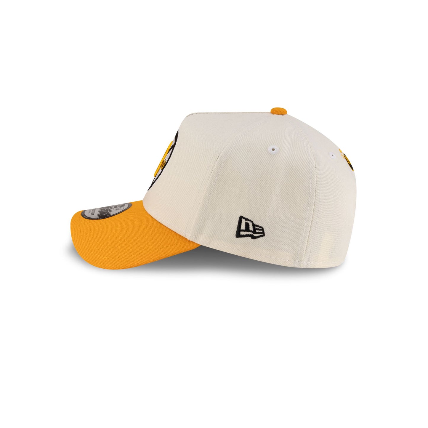 The Boston Bruins Chrome White 9FORTY A-Frame Trucker features an embroidered commemorative Bruins logo at the front panels with the NHL Shield and stars above a snapback closure at the rear and a green undervisor.