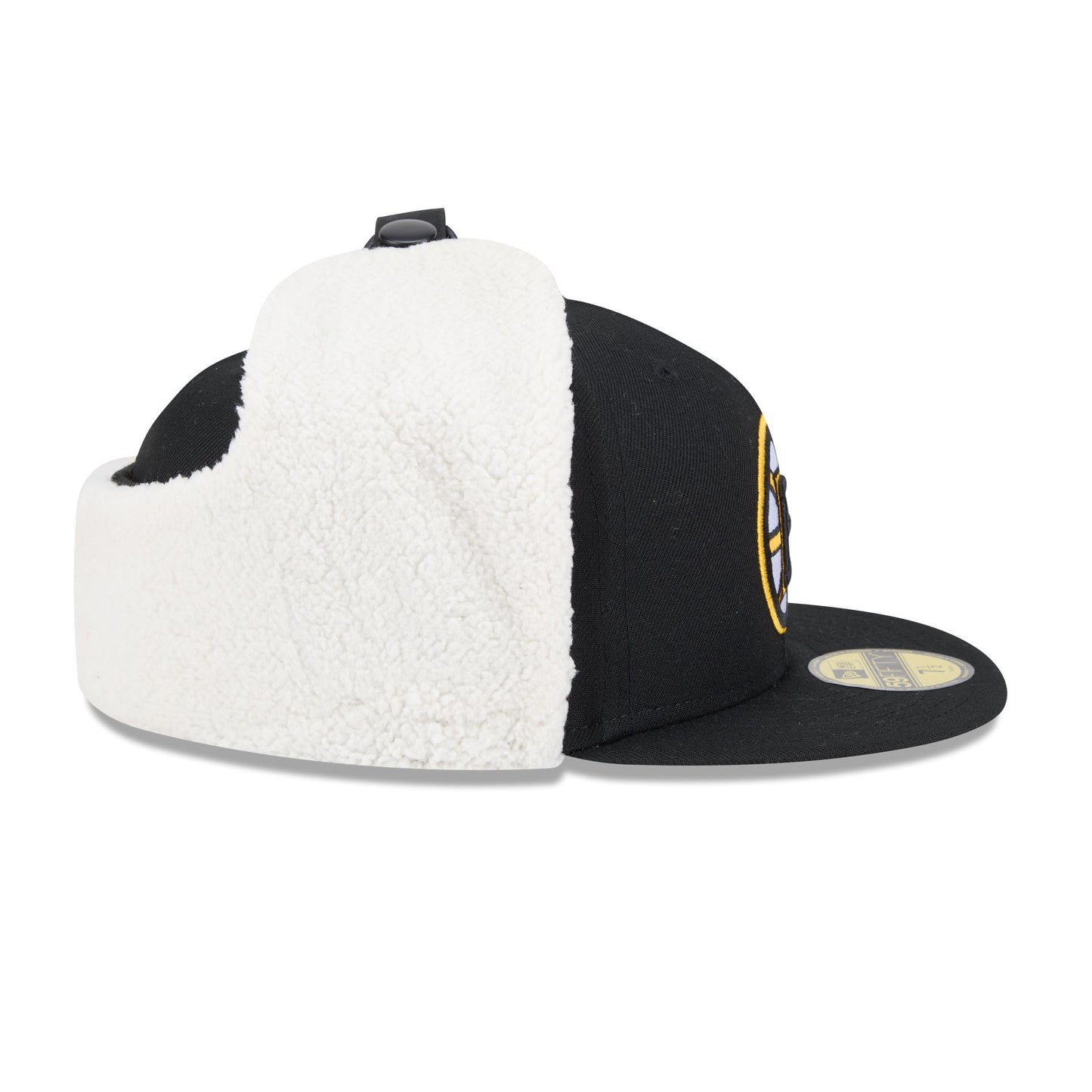 The Boston Bruins Classic Dog Ear 59FIFTY Fitted Cap features an embroidered Bruins logo at the front panels with sherpa ear covers with a snap button closure. Additional details include the NHL Shield logo at the rear and a gray undervisor.