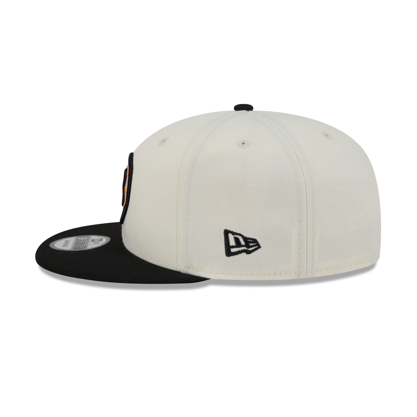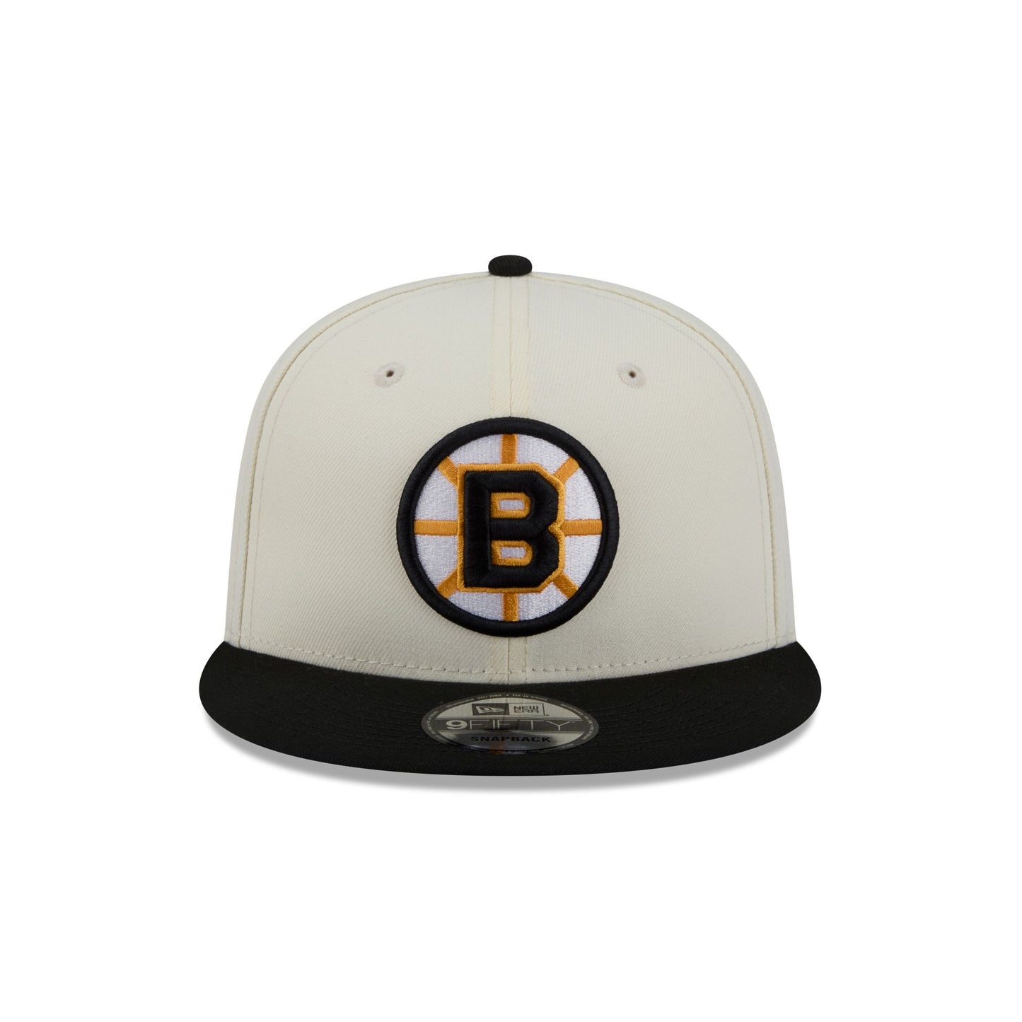 The Boston Bruins Localized 9FIFTY Snapback features an embroidered Bruins logo at the front panels with a state patch at the right-wear side. Additional details include an adjustable snapback closure at the rear and a green undervisor.