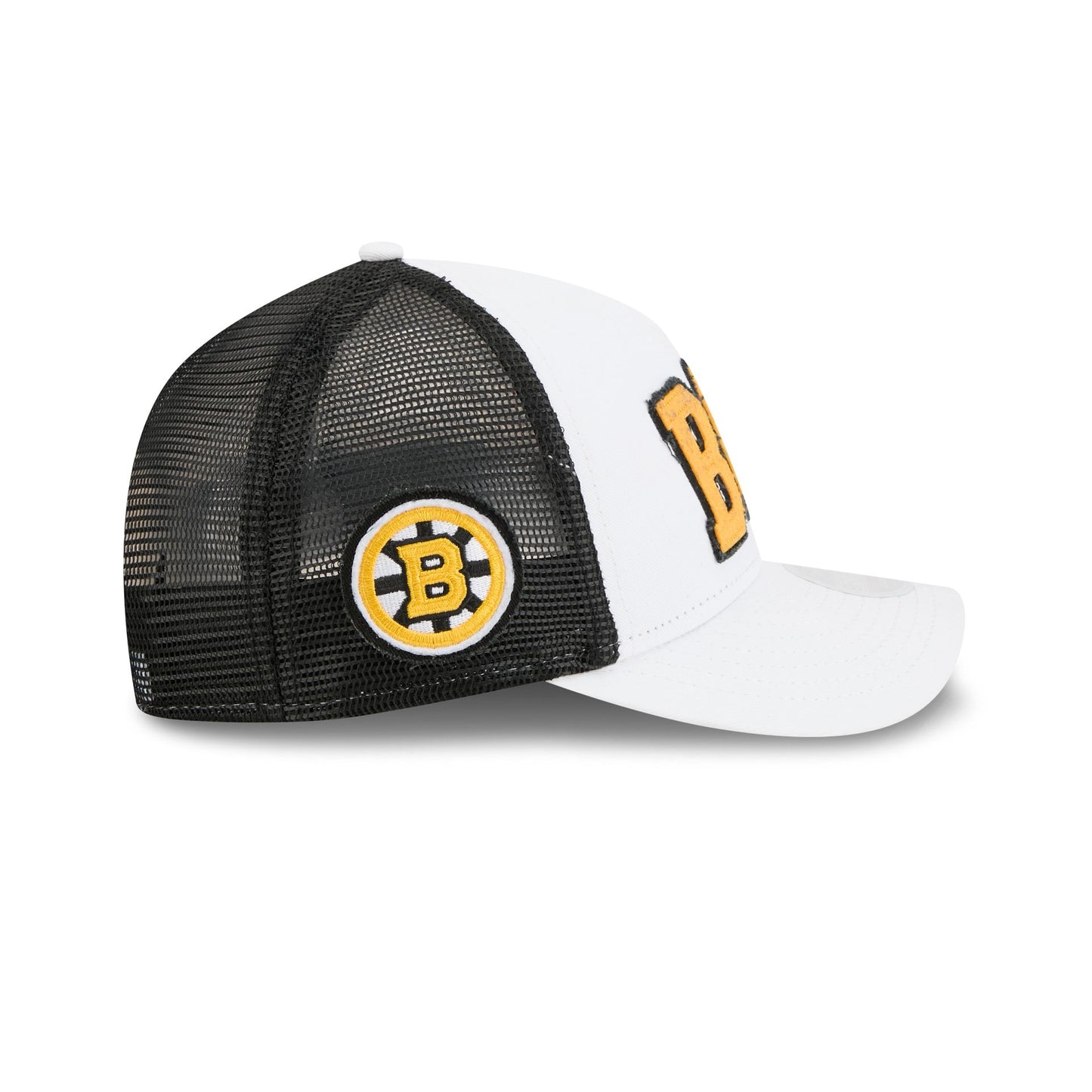 The Boston Bruins Optic White Felt Logo Women's 9FORTY M-Crown A-Frame Trucker features an embroidered felt Bruins abbreviated wordmark at the front panels. Additional details include an adjustable snapback closure at a mesh rear and a team color undervisor.