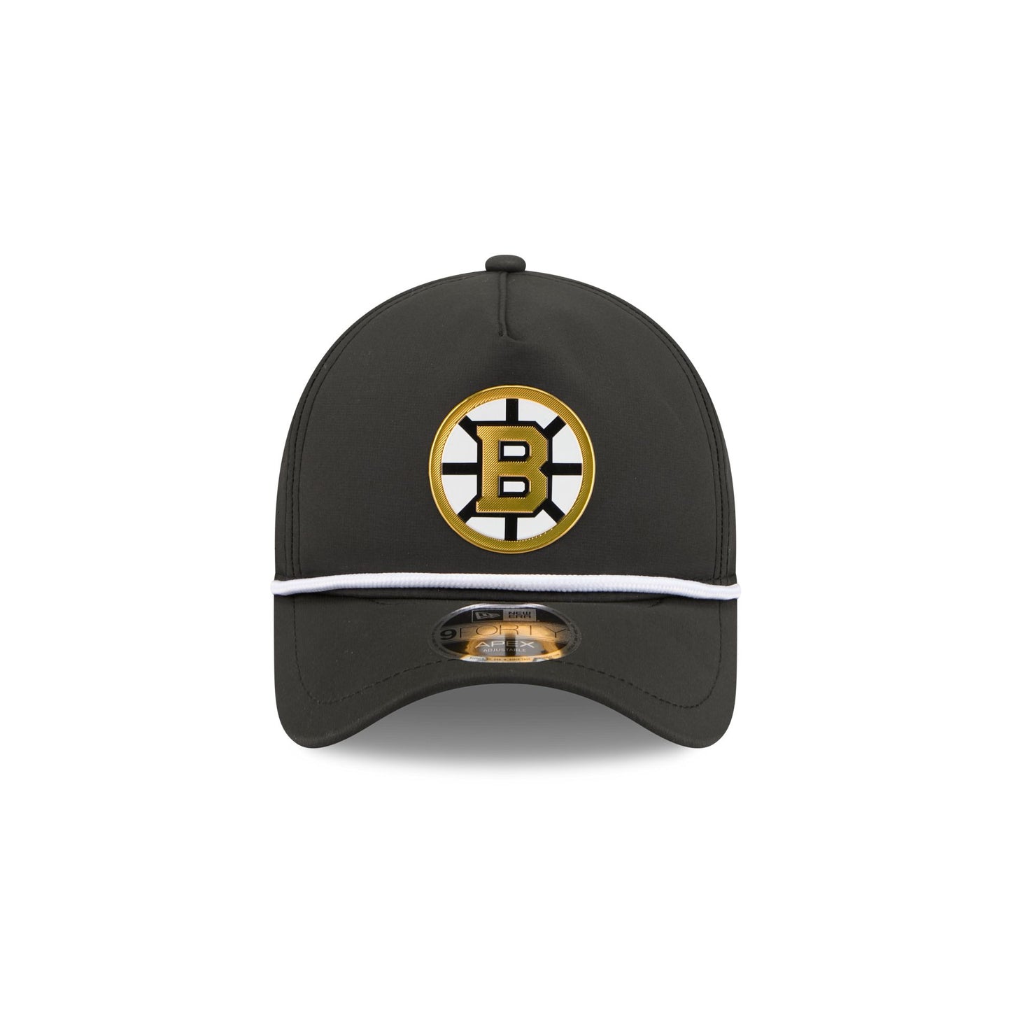 The Boston Bruins Performance 9FORTY APEX Snapback features a heat sealed chrome TPU Bruins logo patch at the front panel with a white rope detail across the visor and a black undervisor. Additional details include a quill-tech performance fabrication and an adjustable snapback closure at the rear panels.