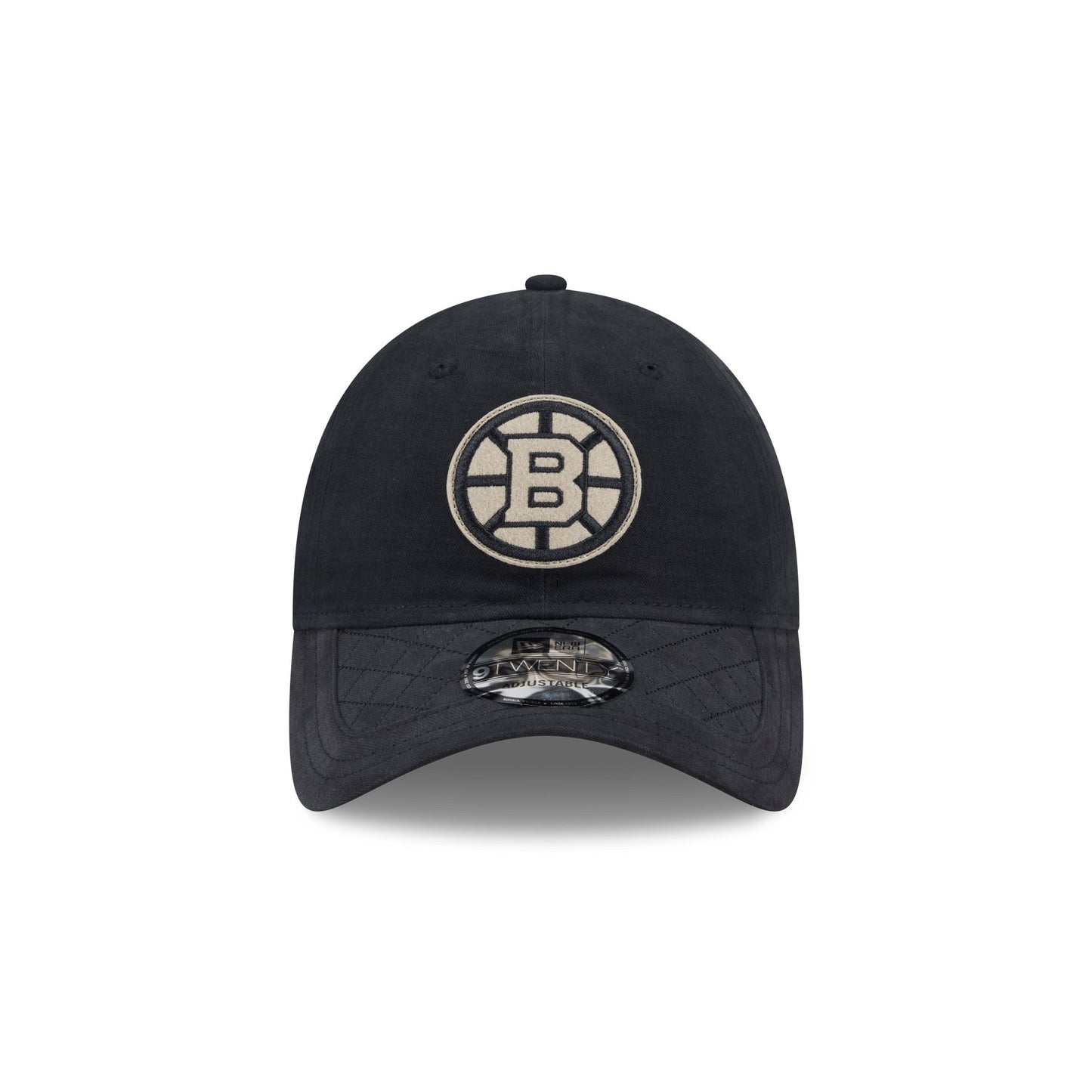 The Boston Bruins Quilted 9TWENTY Adjustable Cap features a double layered felt applique Bruins logo at the front panels with a matching team wordmark tag above an adjustable D-Ring closure at the rear, a brushed cotton fabrication, and quilted stitch details at the visor.