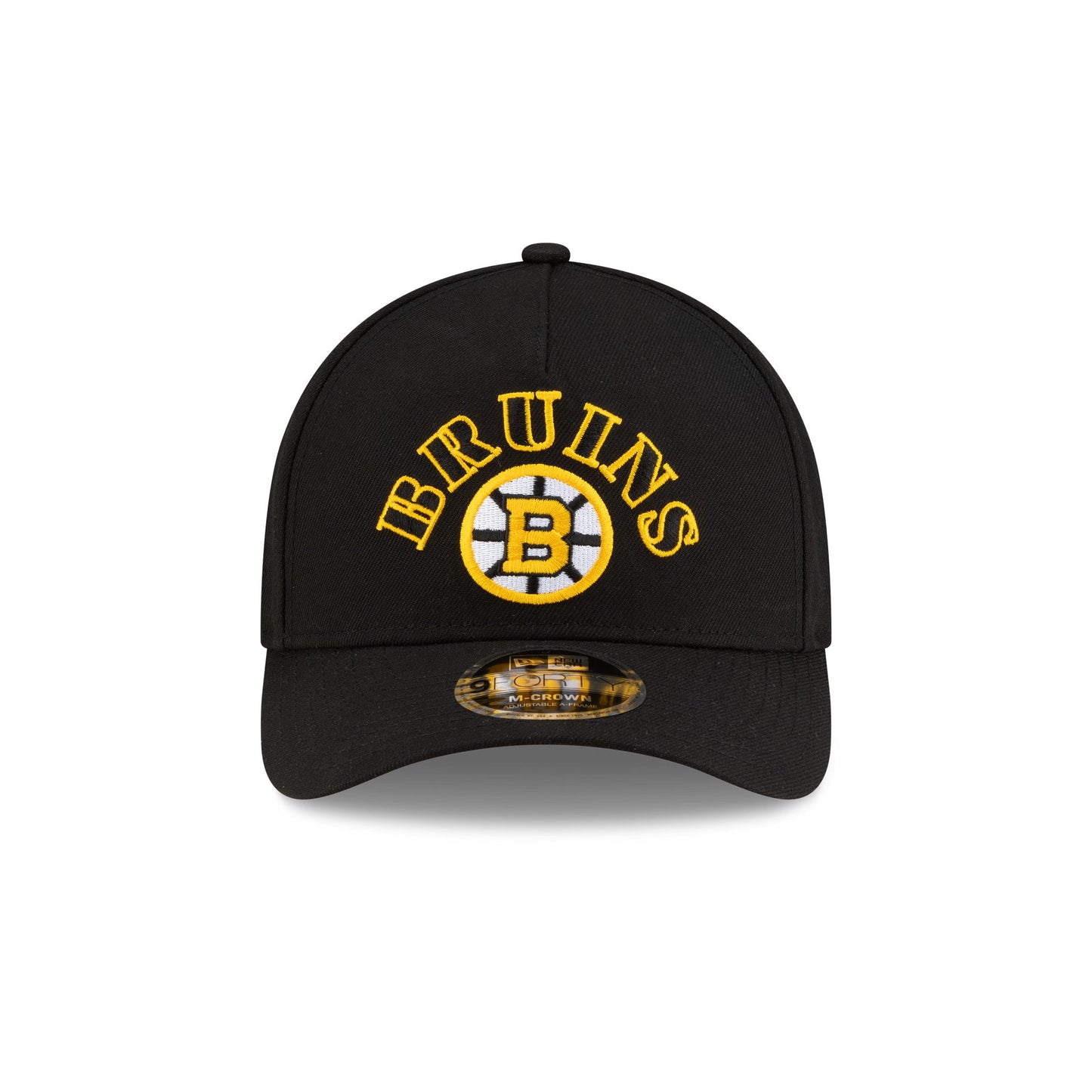 The Boston Bruins Retro Arch 9FORTY M-Crown A-Frame Snapback features an embroidered Bruins arched wordmark and logo at the front panels with the NHL Shield above an adjustable snapback closure at the rear and a gray undervisor.