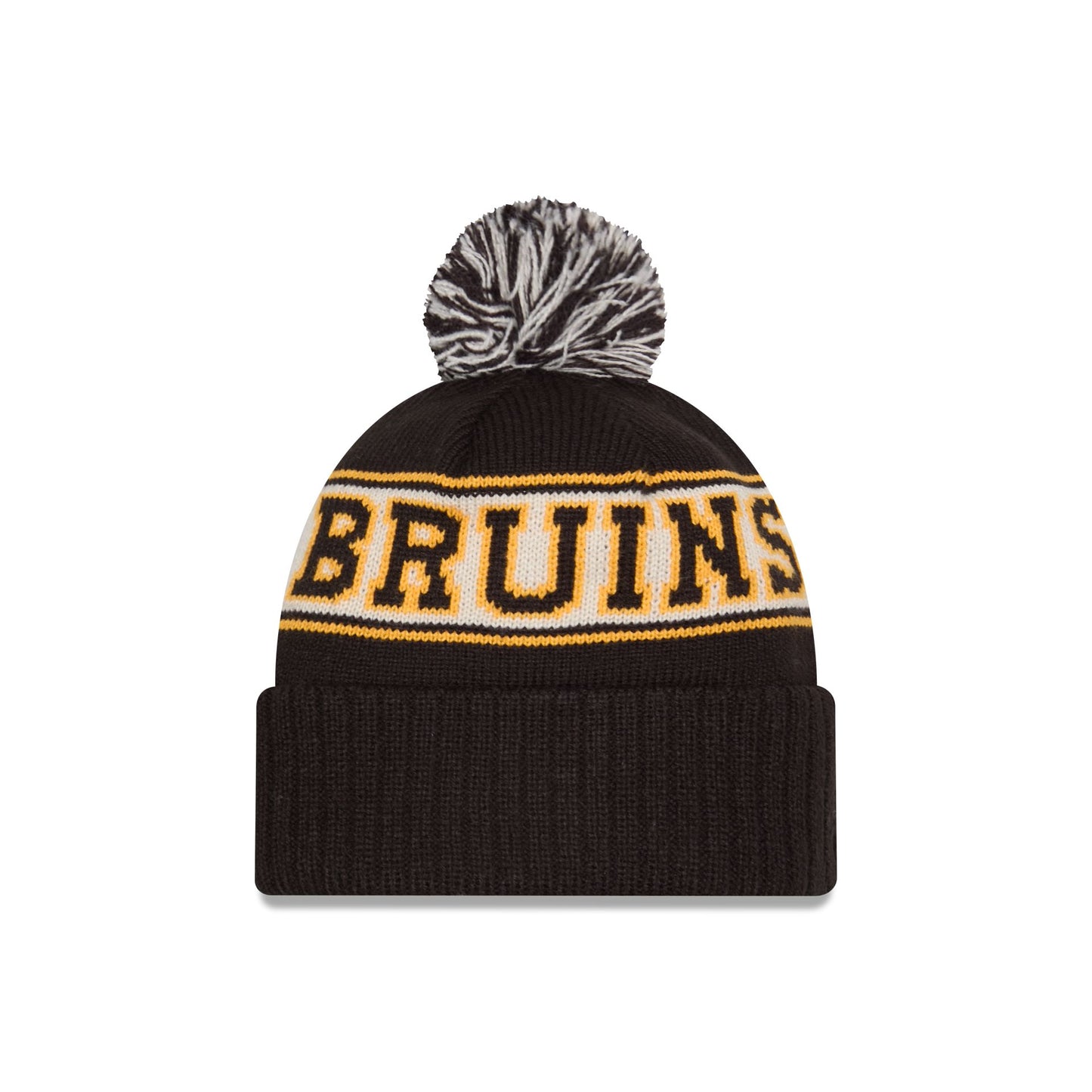 The Boston Bruins Retro Pom Knit Hat features an embroidered Bruins logo at the front cuff with a team wordmark at the crown and a one-time removable pom.
