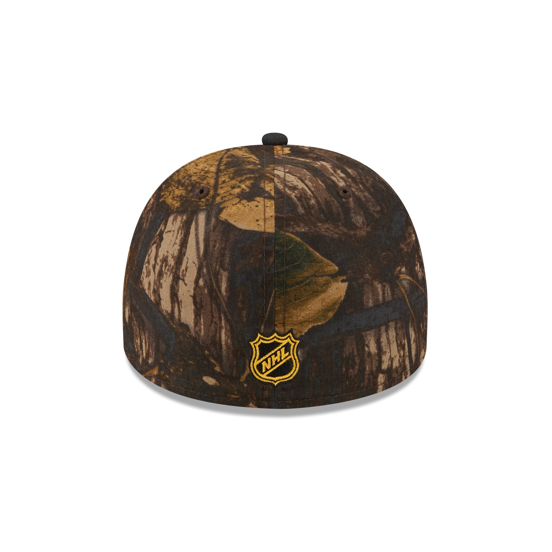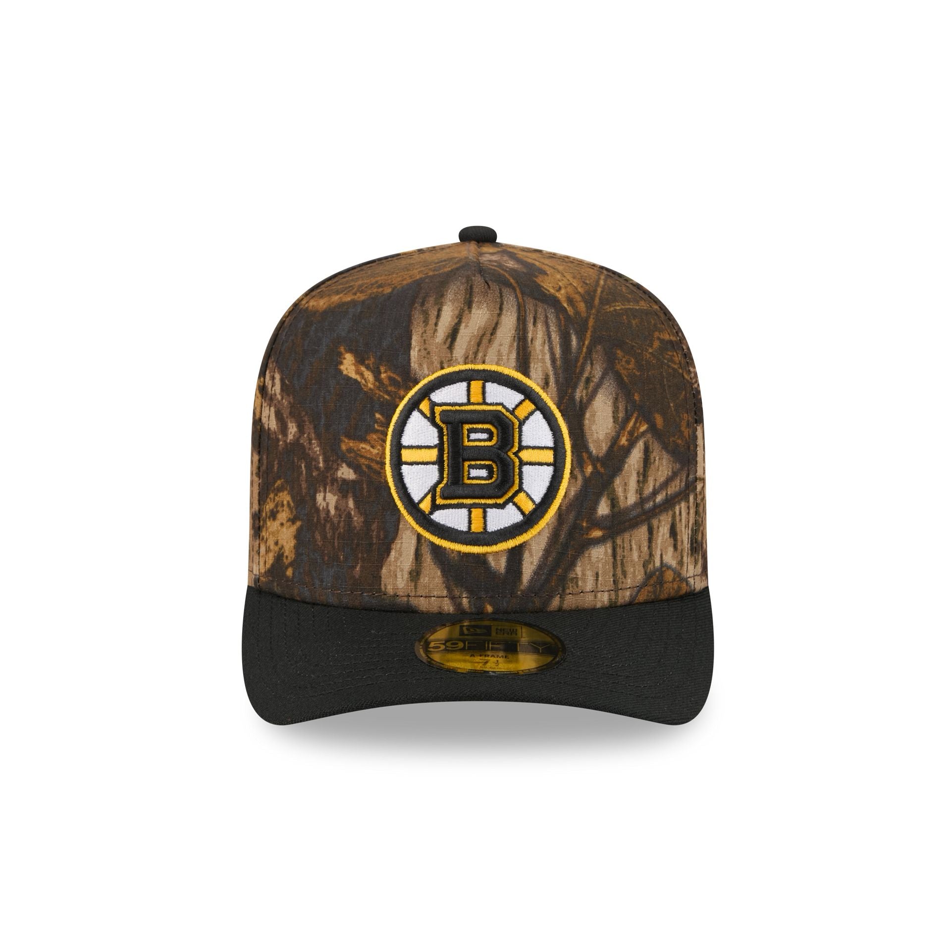 The Boston Bruins Ripstop Camo 59FIFTY A-Frame Fitted Cap features an embroidered Bruins logo at the front panels against a specialty Japanese milled ripstop camo fabrication from Three Looms Japan Fabrics throughout the cap. Additional details include an NHL Shield logo at the rear and a gray undervisor.