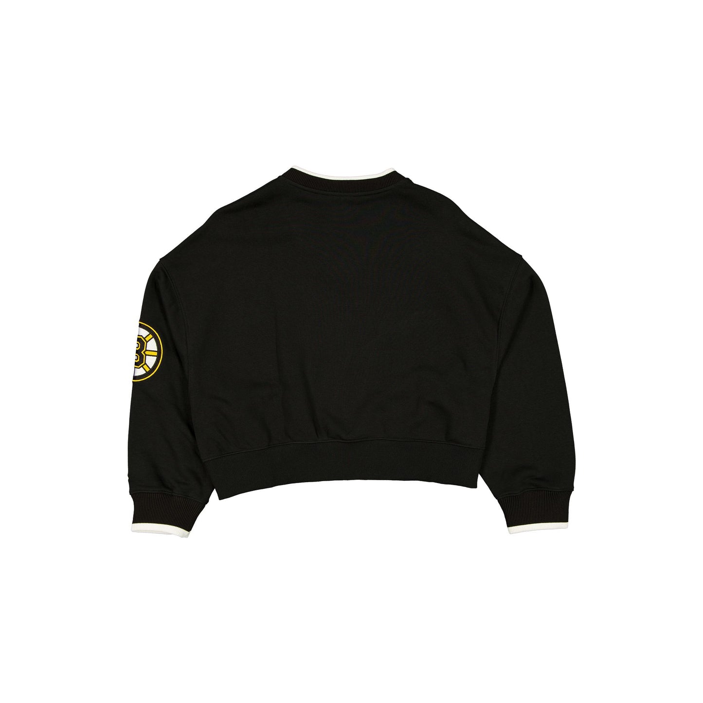 The Boston Bruins Throwback Prep Women's Cropped Crewneck features a screen-printed Bruins wordmark at the chest with an embroidered script wordmark below. Additional details include an embroidered logo at the left arm and a cropped fit.
