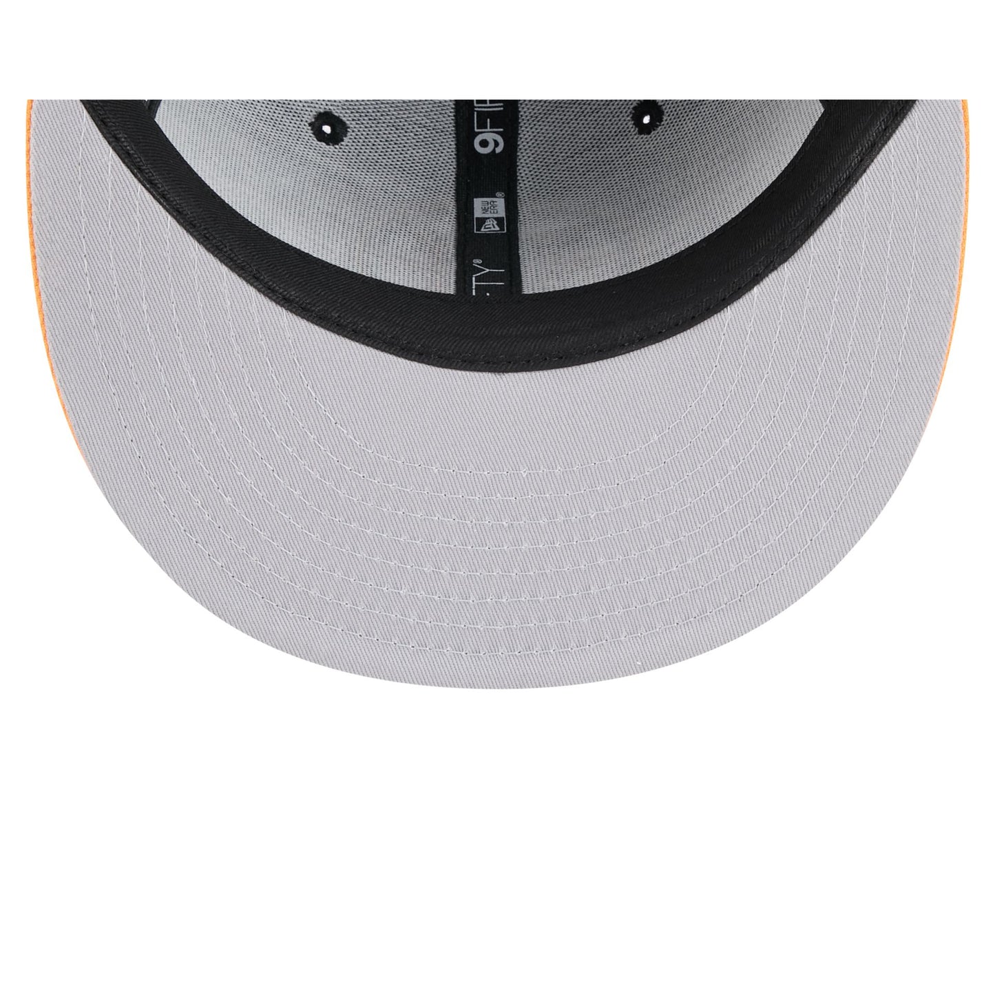 The Boston Bruins Team Color 9FIFTY Snapback features an embroidered Bruins logo at the front panels with a matching visor, a gray undervisor, and a snapback closure at the rear.