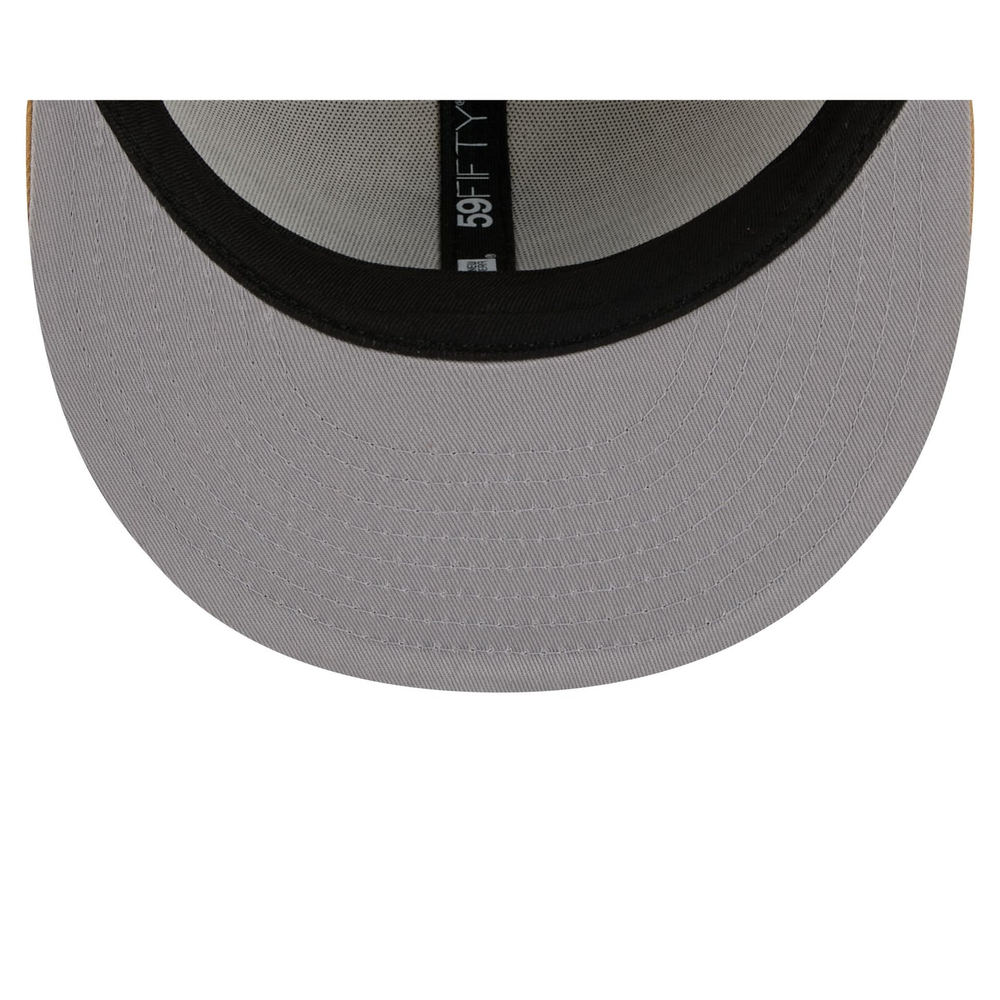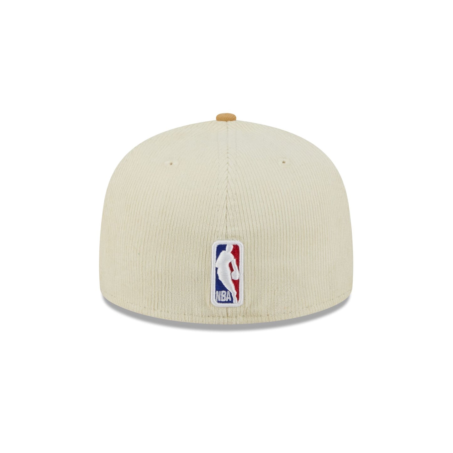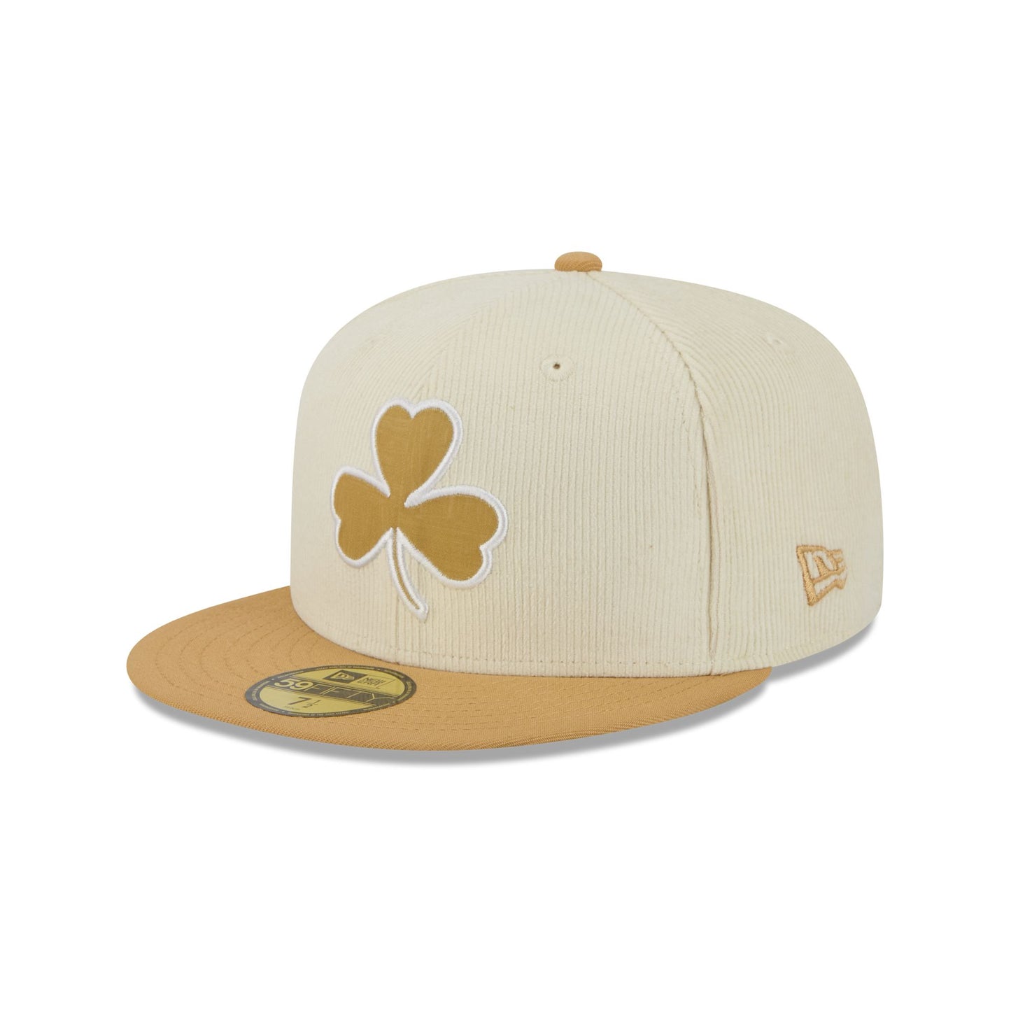 The Boston Celtics 2025 City Edition Chrome White Corduroy 59FIFTY Fitted Cap features an embroidered Celtics City Edition logo at the front panels with a City Edition jock tag stitched at the right-wear side. Additional details include a corduroy fabrication, the NBA Logoman at the rear, and a gray undervisor.