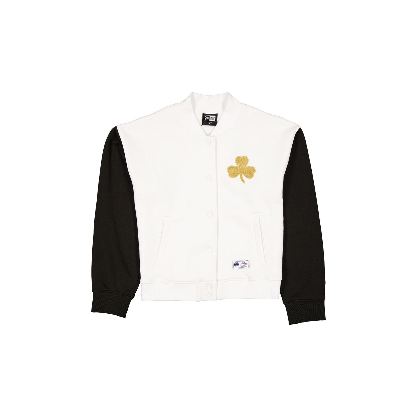 The Boston Celtics 2025 City Edition Women's Jacket features an embroidered Celtics chenille logo at the left chest with a snap button closure, pockets and a City Edition jock tag at the left hip.
