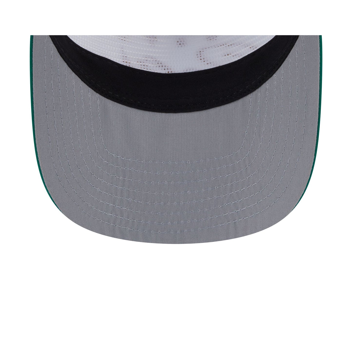The Boston Celtics 2025 Draft 19TWENTY Adjustable Cap features an embroidered Celtics script wordmark at the front panels with a team logo at the right-wear side. Additional details include a woven silicone NBA Logoman patch above an adjustable buckle closure at the rear and a gray undervisor. The strap features a National Basketball Association gel print wordmark.