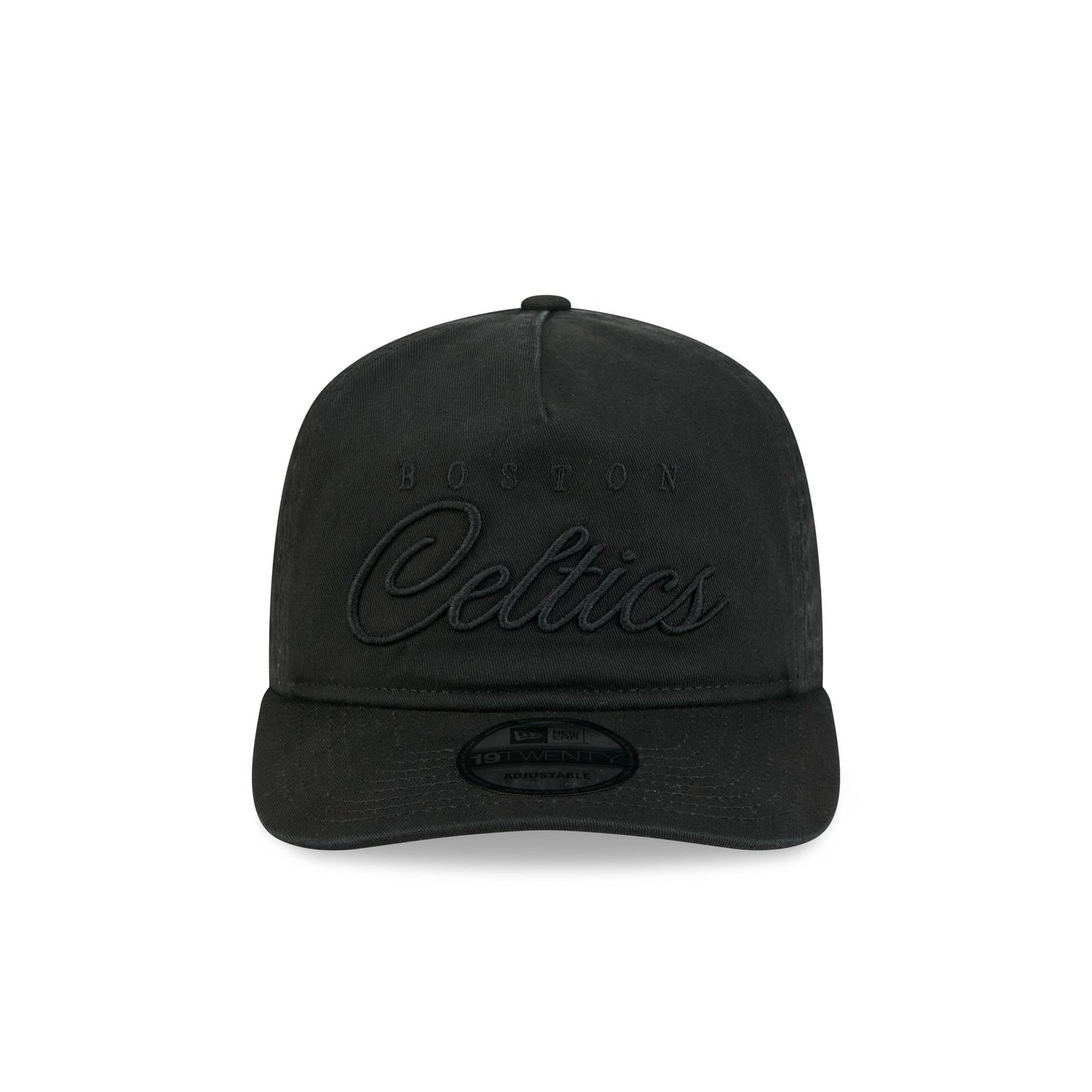 The Boston Celtics All Black Scripted 19TWENTY Adjustable Cap features an embroidered Celtics all black script wordmark at the front panels with a matching team logo at the right-wear side. Additional details include an adjustable snapback closure at the rear and a gray undervisor.