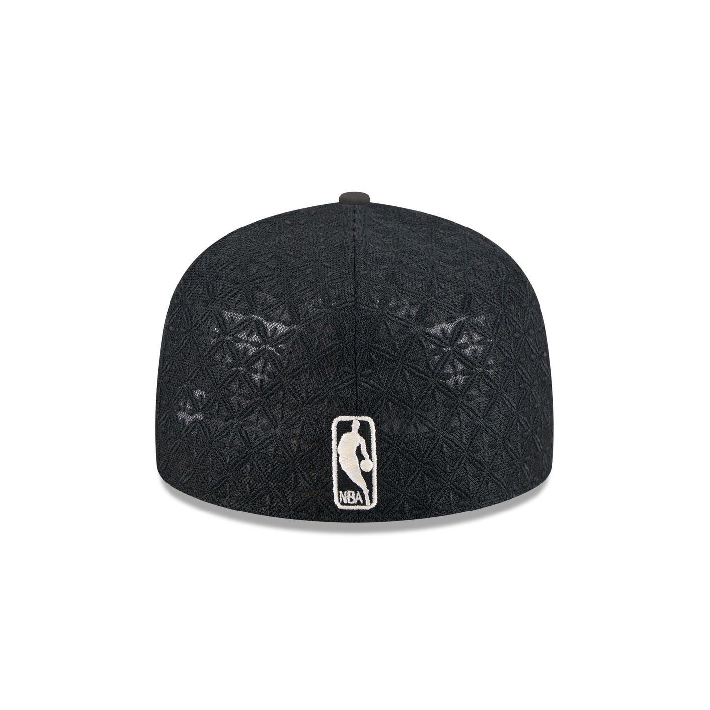 The Boston Celtics Black Mesh 59FIFTY A-Frame Fitted Cap features an embroidered Celtics logo at the front panels with a matching NBA Logoman at a patterned mesh rear.