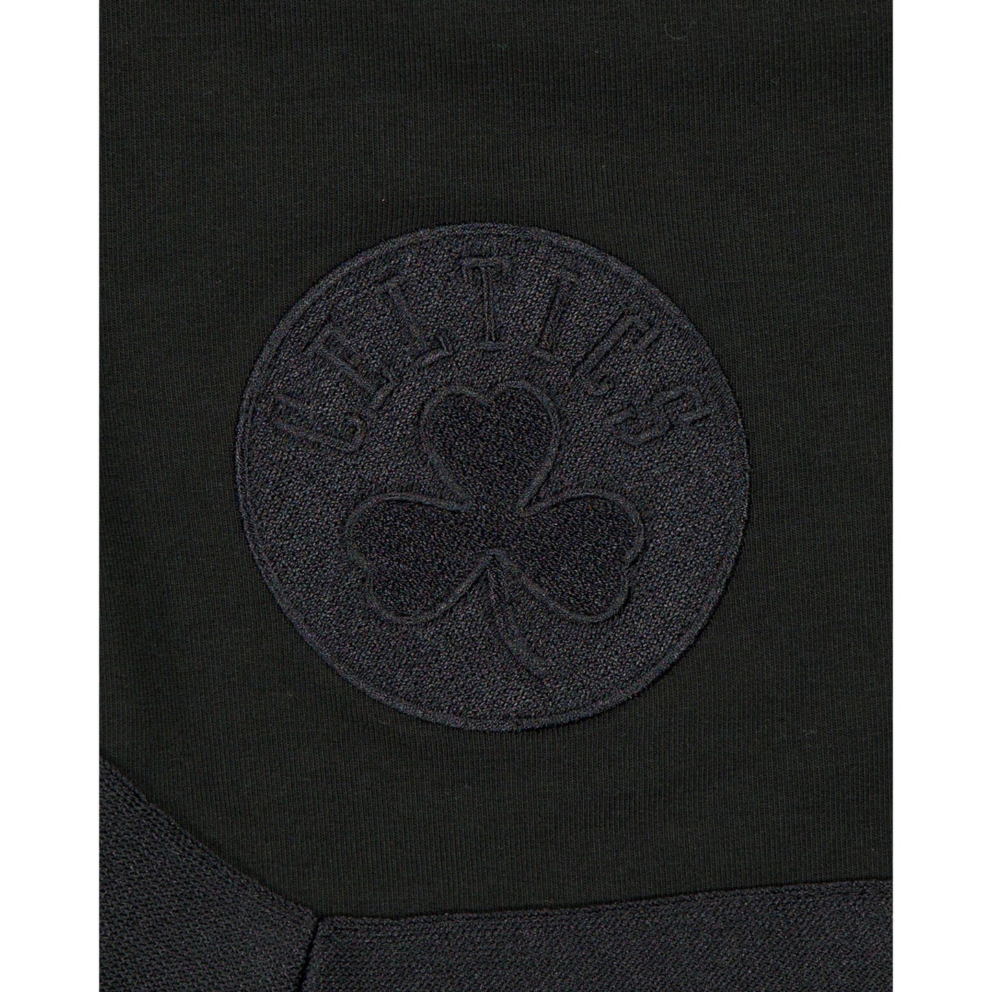 The Boston Celtics Black on Black Logo Select Shorts features an embroidered Celtics logo at the right-wear leg and a satin applique with a tonal stitch team wordmark at the rear left leg.