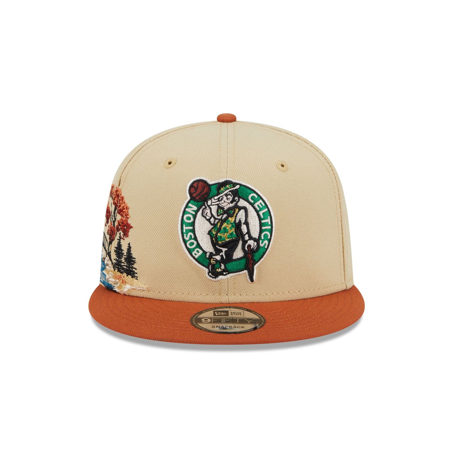 The Boston Celtics Fall Landscape 9FIFTY Snapback features an embroidered Celtics logo at the front panels with a fall landscape at the right-wear side, a gray undervisor, and a snapback closure at the rear.