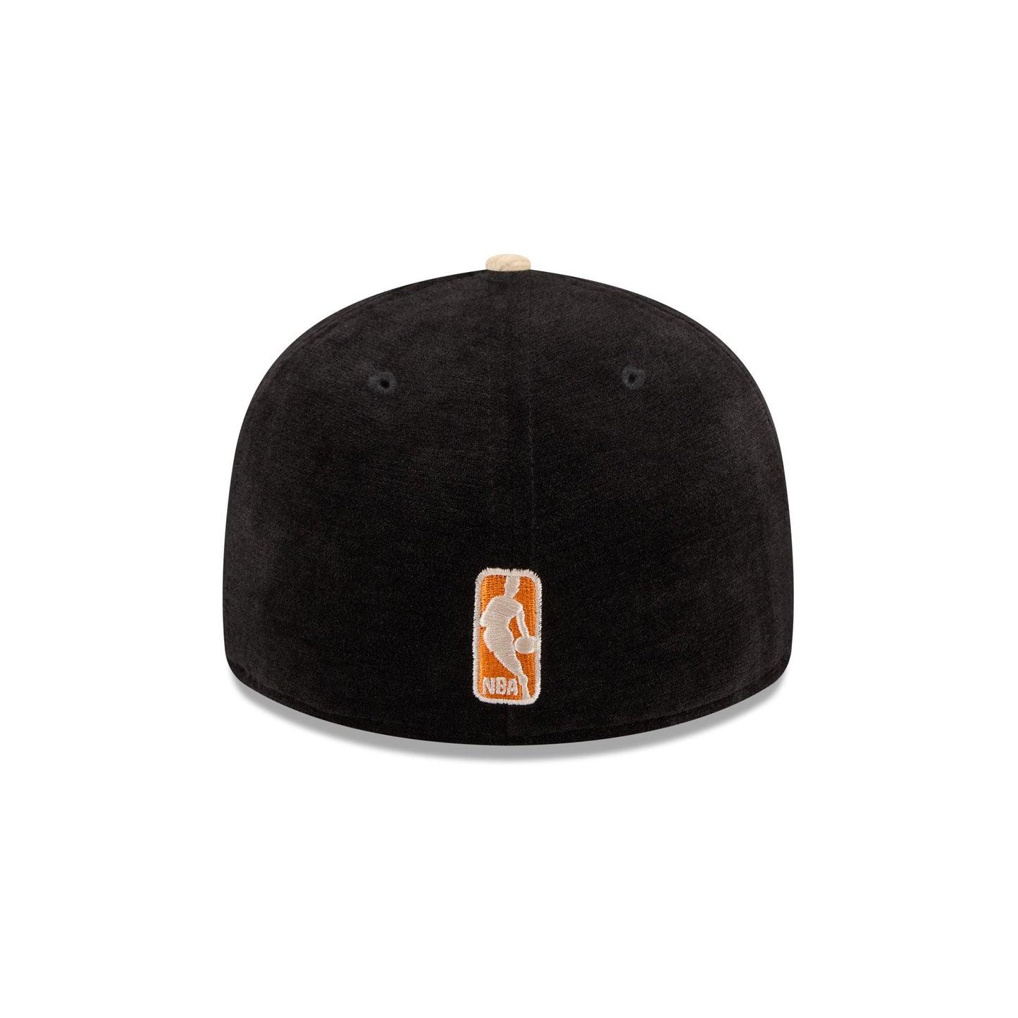 The Boston Celtics Fall Velvet Low Profile 59FIFTY Fitted Cap features an embroidered Celtics fall gradient logo at the front panels against a velvet fabrication throughout. Additional details include an antique brass leather stitch down city plate at the right-wear side, a matching NBA Logoman at the rear, and a green undervisor.
