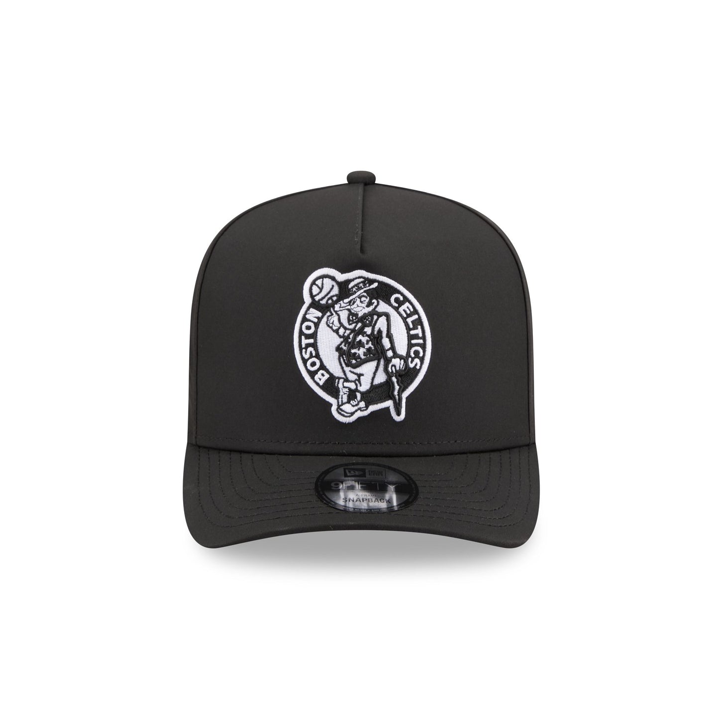 The Boston Celtics GORE-TEX Black 9FIFTY A-Frame Snapback features an embroidered white Celtics logo at the front panels with a metallic sheen silicone New Era Flag logo and GORE-TEX logo at the left-wear side. Additional details include an adjustable snapback closure at the rear, a gray undervisor, and a polyester fabrication throughout the cap. It is waterproof, breathable, and lightweight.