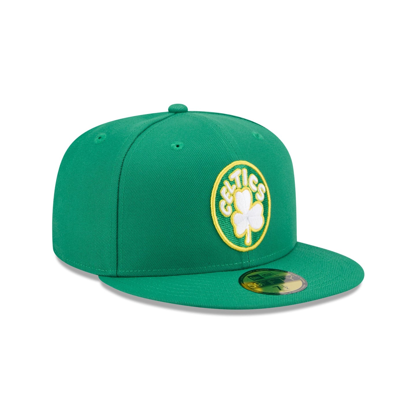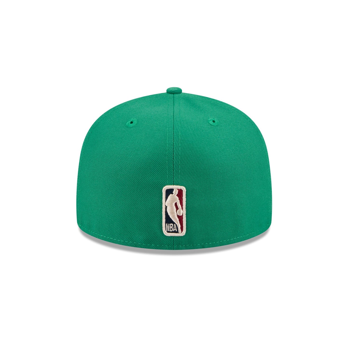 The Boston Celtics 1914-1928 Hardwood Classics 59FIFTY Fitted Cap features an embroidered vintage Celtics logo at the front panels with the NBA Logoman at the rear and a gray undervisor.