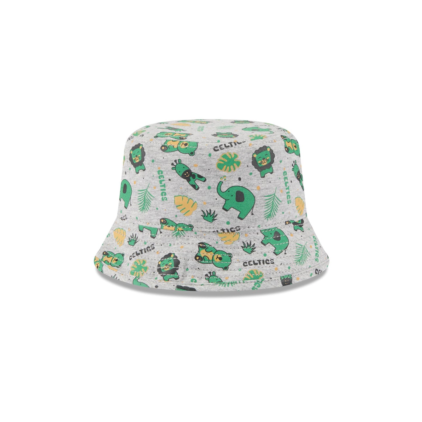 The Boston Celtics Kids Animal Bucket Hat features an embroidered Celtics logo at the front with screen-printed animals throughout.