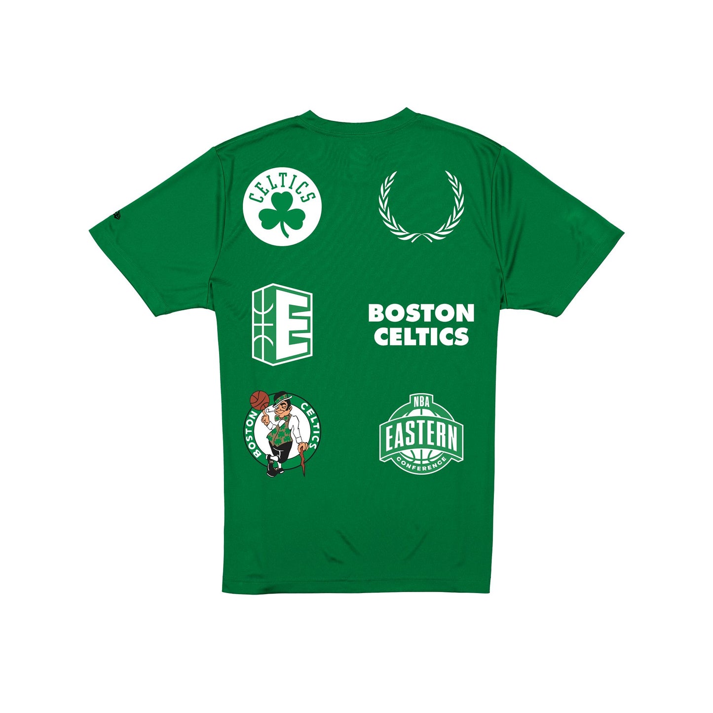 The Boston Celtics Match Day Green T-Shirt features a screen-printed Celtics logo at the left chest and a wordmark at the front. Additional details include a New Era logo at the right chest, a New Era jock tag at the left hip, and team graphics at the rear.