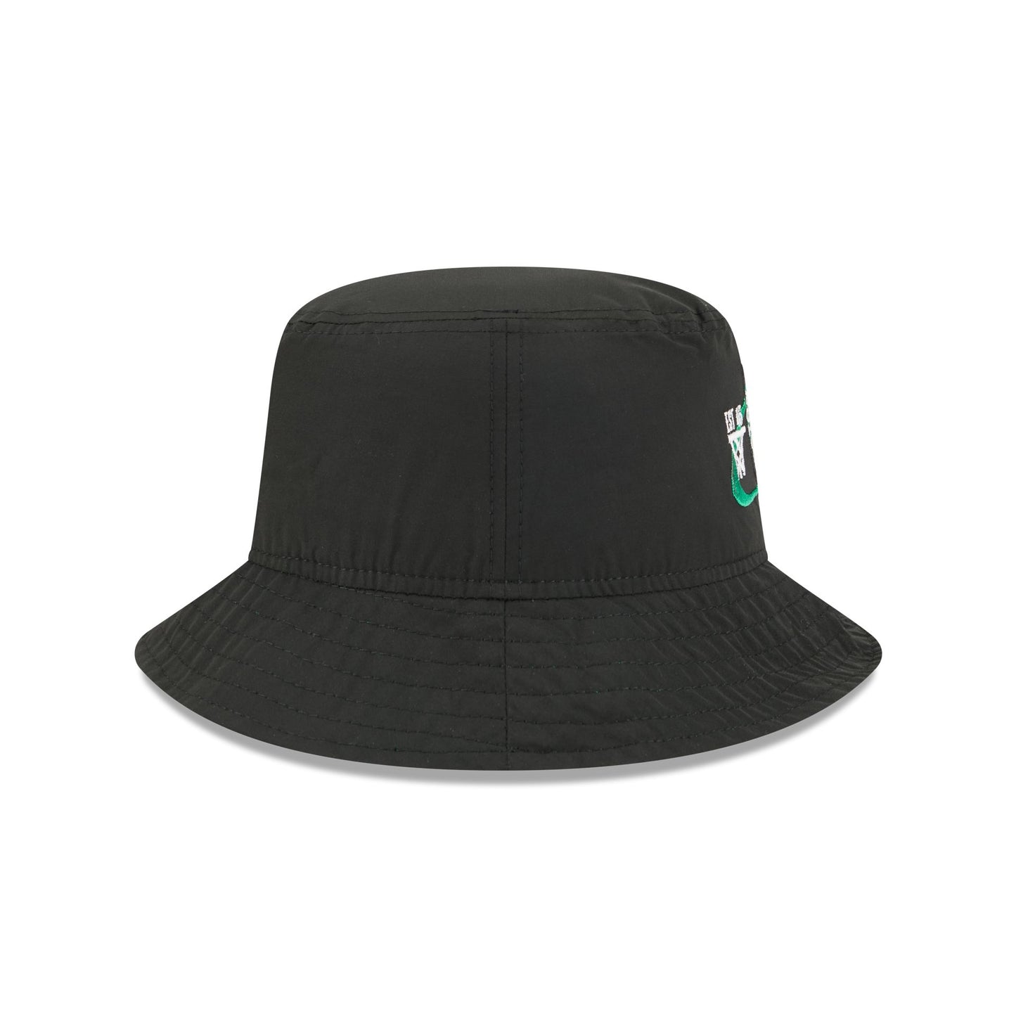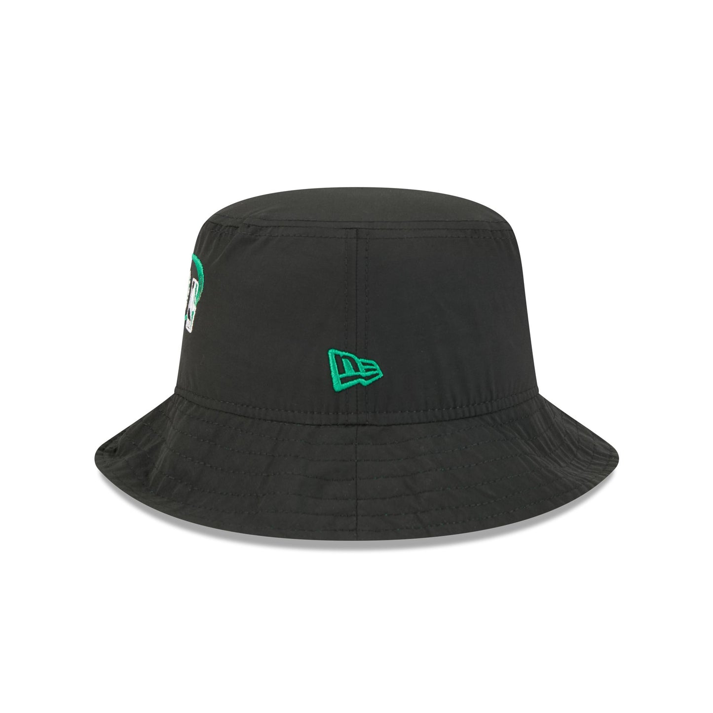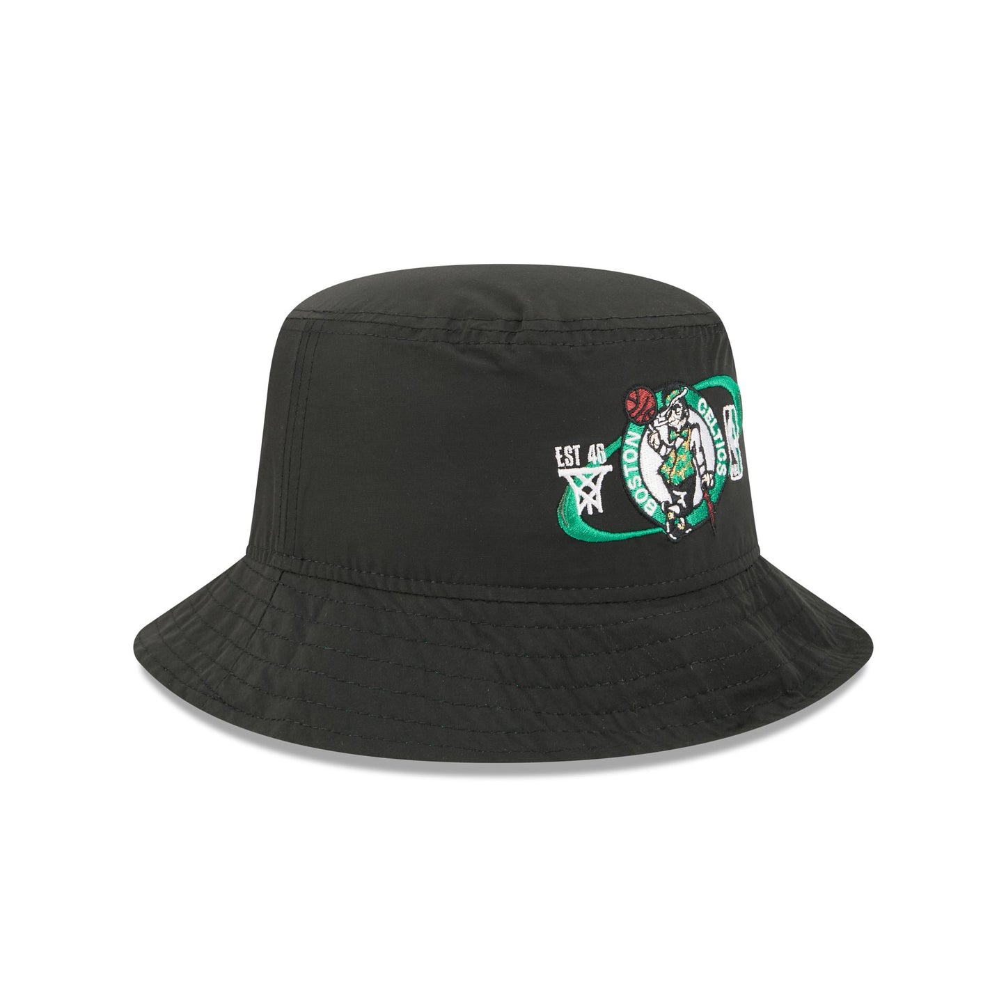 The Boston Celtics Nylon Logo Bucket Hat features an embroidered Celtics logo, establishment date, and NBA Logoman at the front.