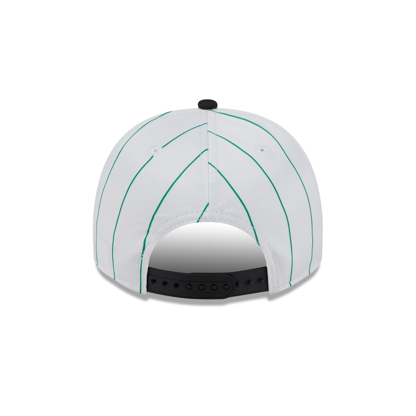 The Boston Celtics Satin Pinstripe 9FIFTY A-Frame Snapback features an embroidered Celtics logo at the front panel with a team color visor, a gray undervisor, and a snapback closure at the rear.