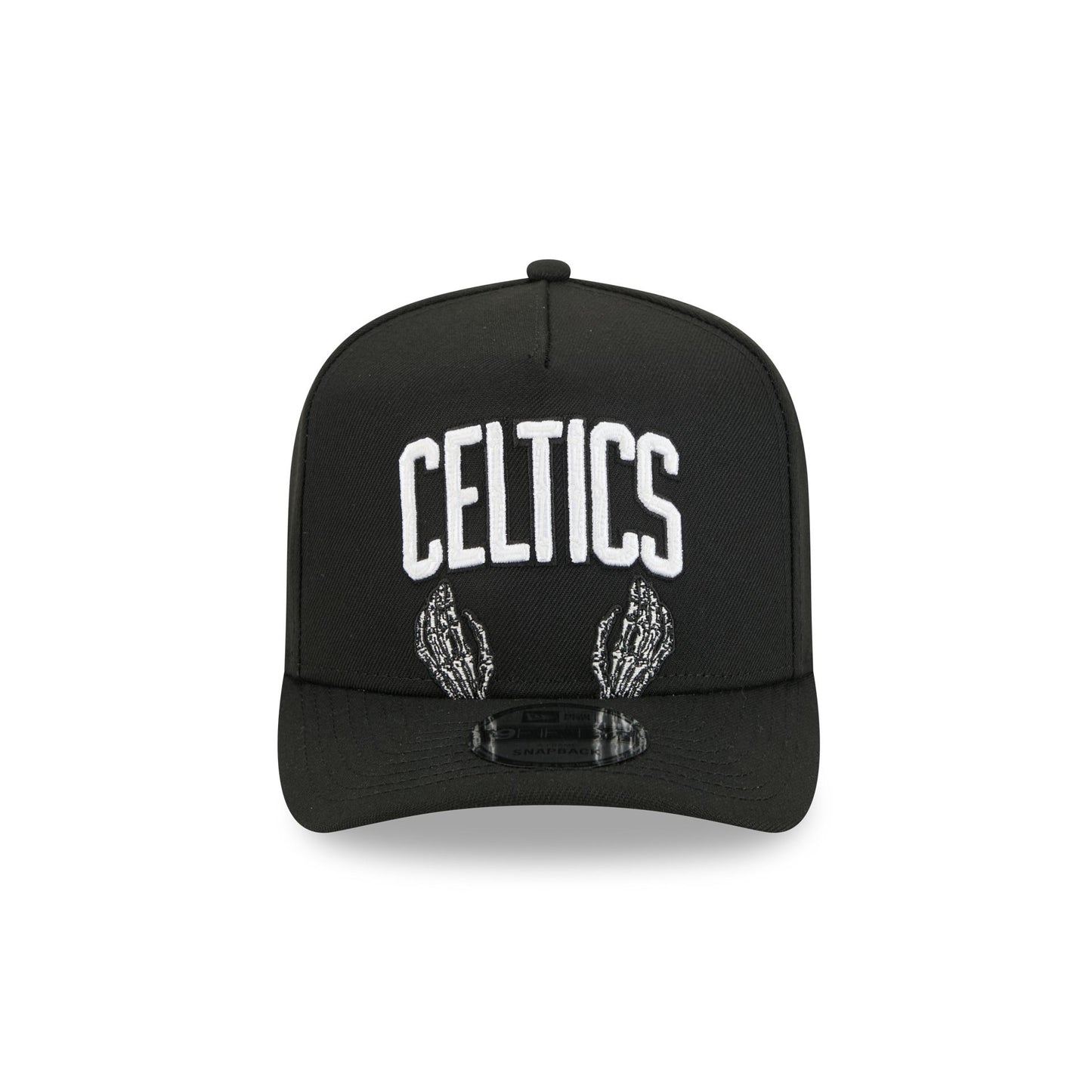 The Boston Celtics Skeletal Script 9FIFTY A-Frame Snapback features a glow-in-the-dark embroidered Celtics wordmark and skeleton hands at the front with an NBA Logoman at the right of a snapback closure at the rear and a gray undervisor.