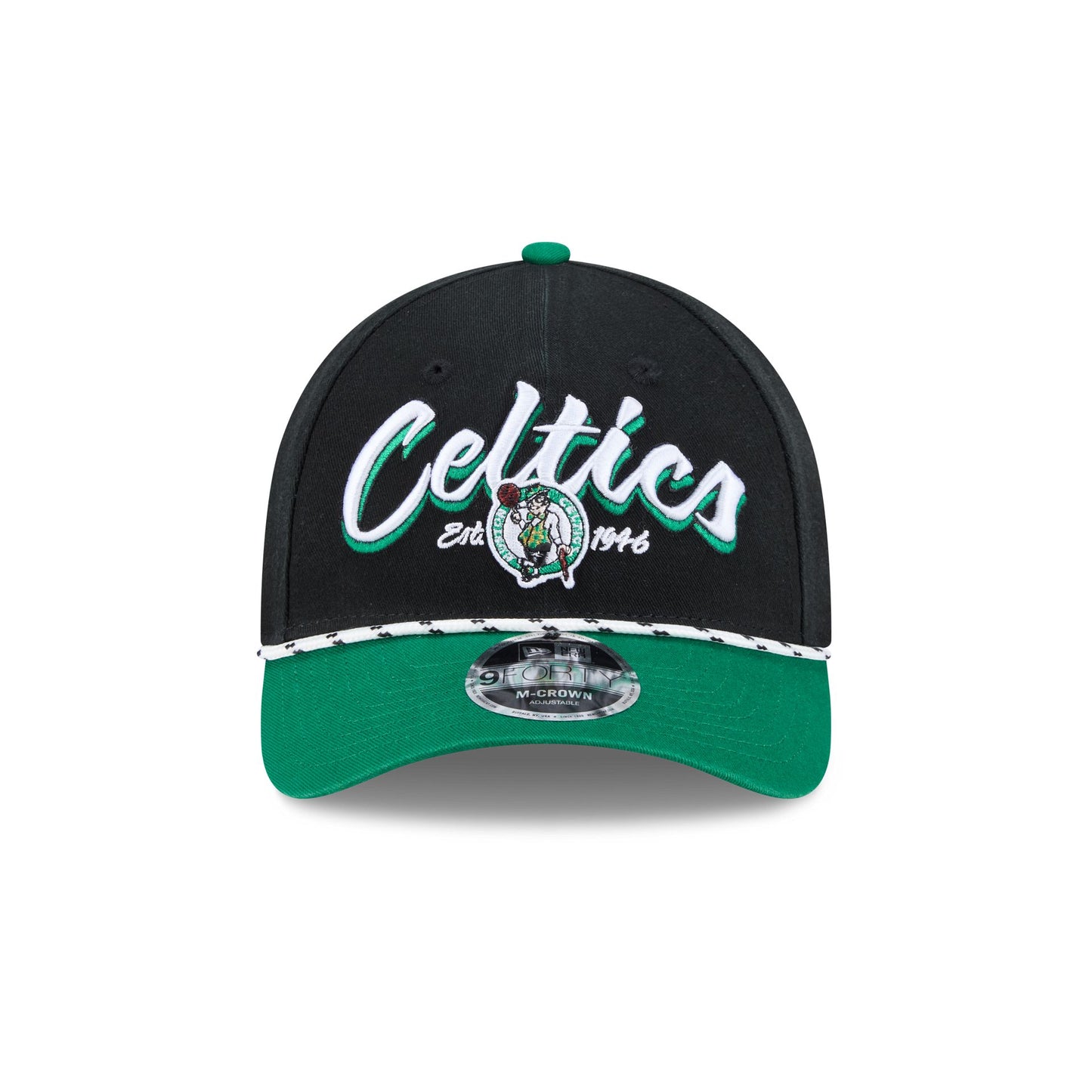 The Boston Celtics Team Loyal 9FORTY M-Crown Snapback features an embroidered Celtics wordmark graphic at the front panels with a rope at the visor. Additional details include an adjustable snapback closure at the rear and a gray undervisor.