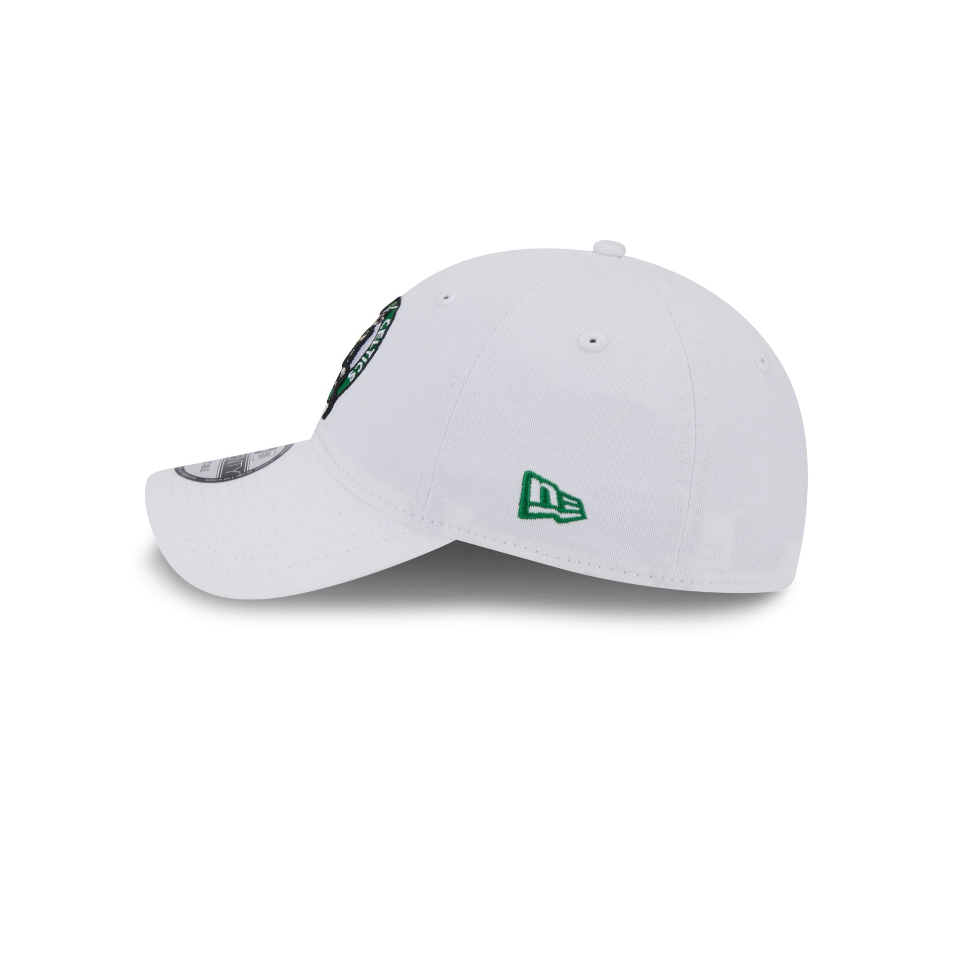 The Boston Celtics White 9TWENTY Adjustable Cap features an embroidered Celtics logo at the front panels with a matching woven team logo tag at the adjustable D-Ring closure at the rear.