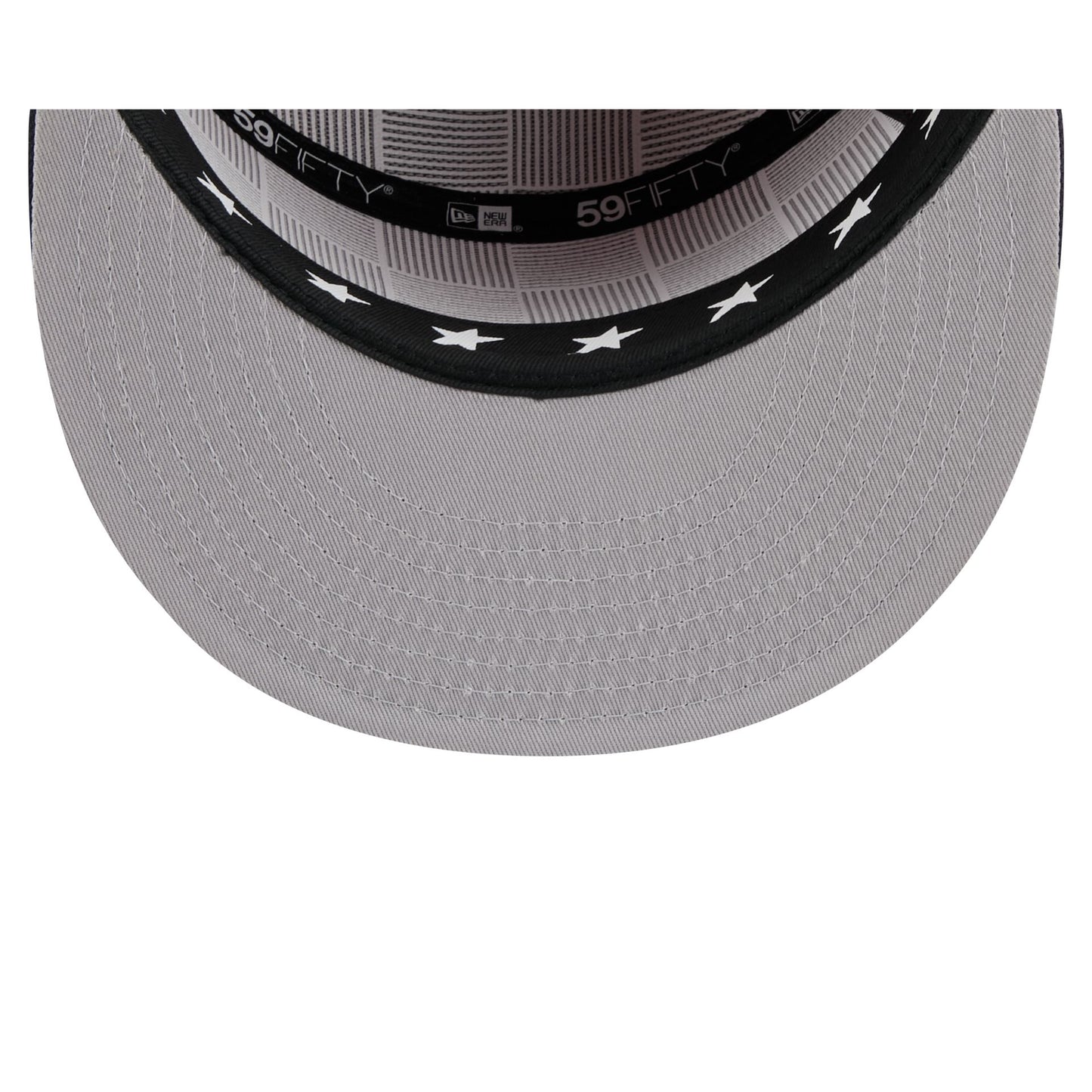 The Boston Red Sox 2025 All-Star Game Split Panel 59FIFTY Fitted Cap features an embroidered Red Sox logo at the front panels against a split-crown construction with breathable mesh fabric at the side and rear panels. Additional details include stars at the top panel, a 2025 All-Star Game patch at the right-wear side, the MLB Batterman logo at the rear, and a gray undervisor. The cap also features screen-printed stars on the sweatband.