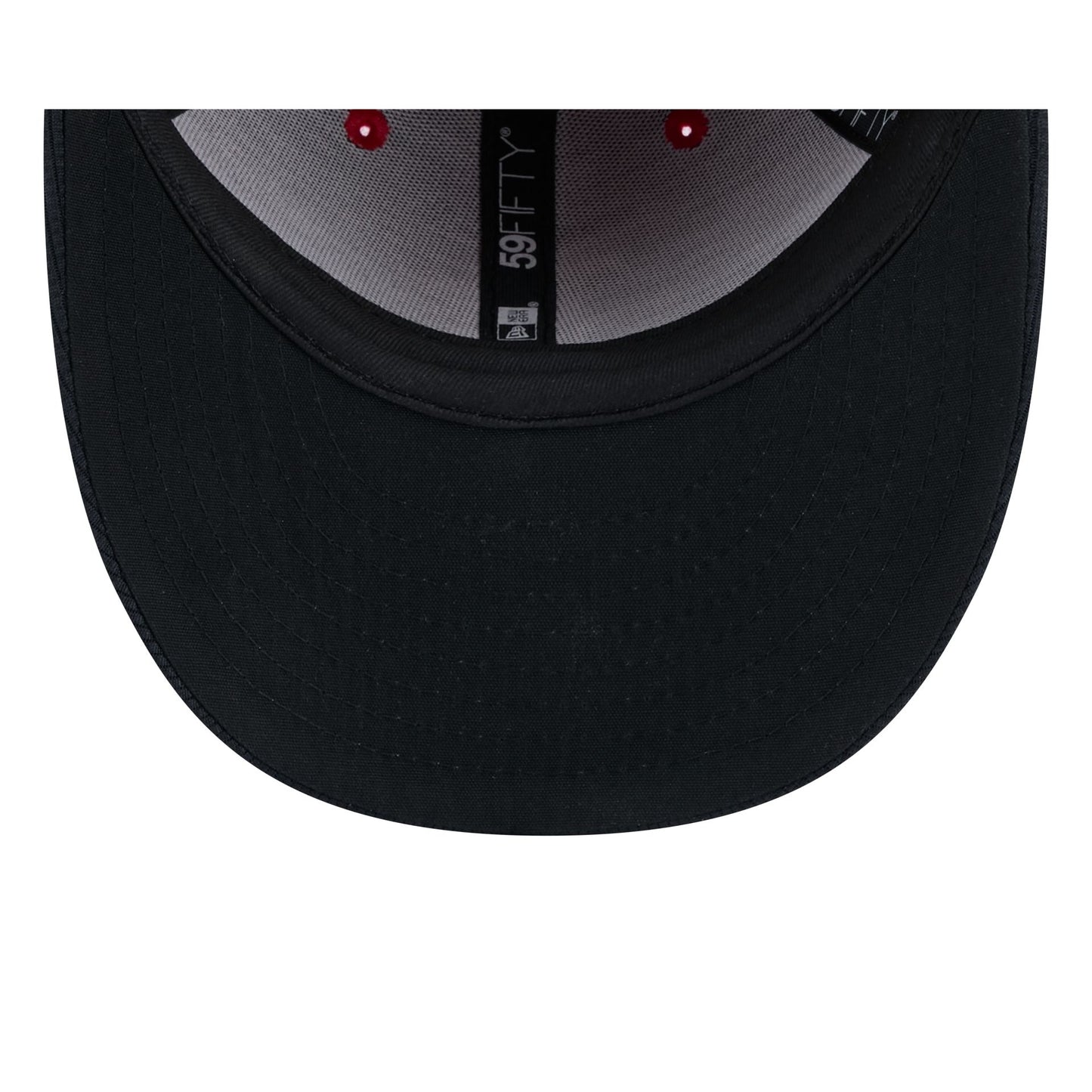 The Boston Red Sox 2025 Spring Training Low Profile 59FIFTY Fitted Cap features an embroidered Red Sox logo at the front panels with a matching MLB Batterman logo at the rear. Additional details include a pivot knit fabrication with a 2025 Spring Training patch at the right-wear side and a black undervisor.