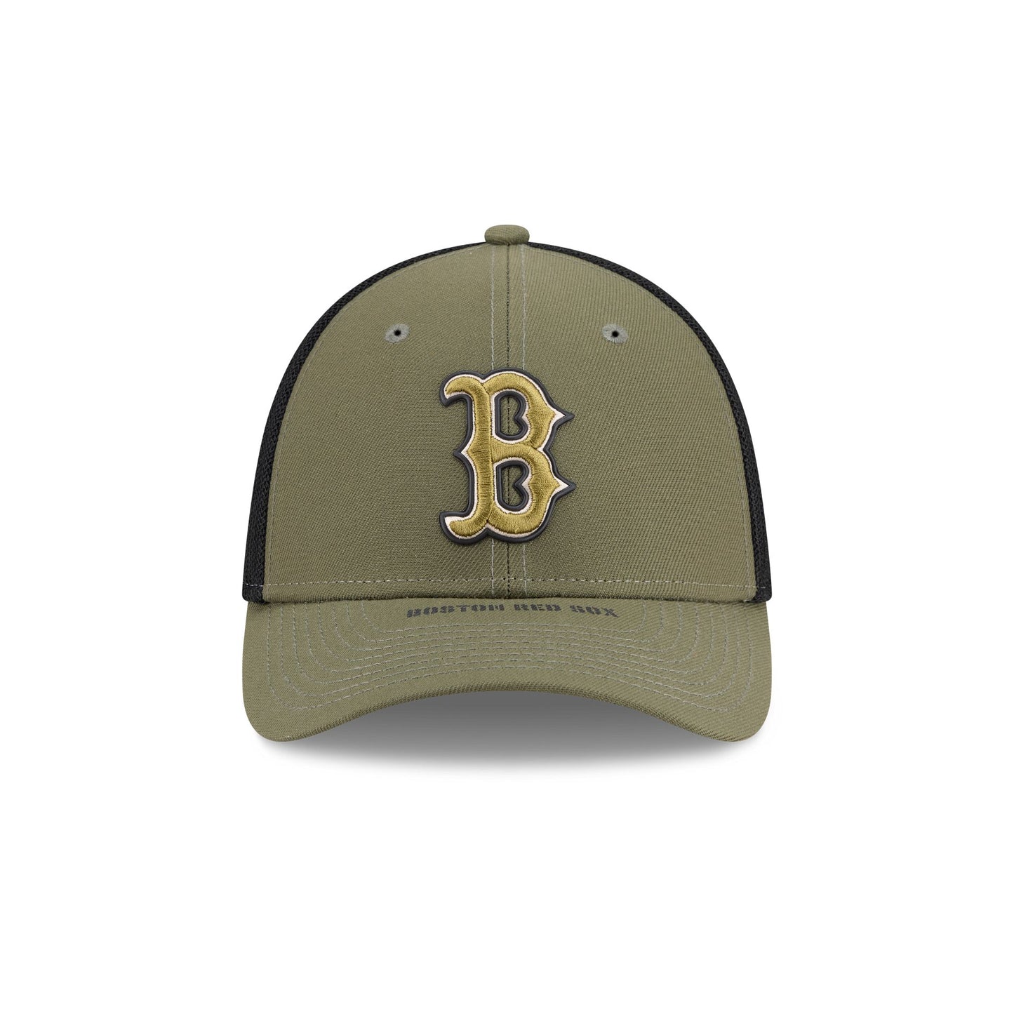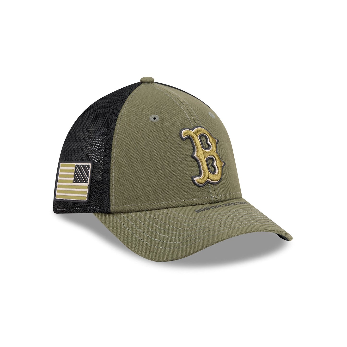 The Boston Red Sox Armed Forces Day 2026 39THIRTY M-Crown Stretch Fit Cap features an embroidered Red Sox patch at the front panels with a matching MLB Batterman logo at the rear mesh panels and a screen-printed team wordmark at the visor. Additional details include a heat sealed silicone USA flag patch at the right-wear side with screen-printed stars at a black undervisor, camo patterned interior panels, and an Armed Forces Day wordmark at the interior tape.