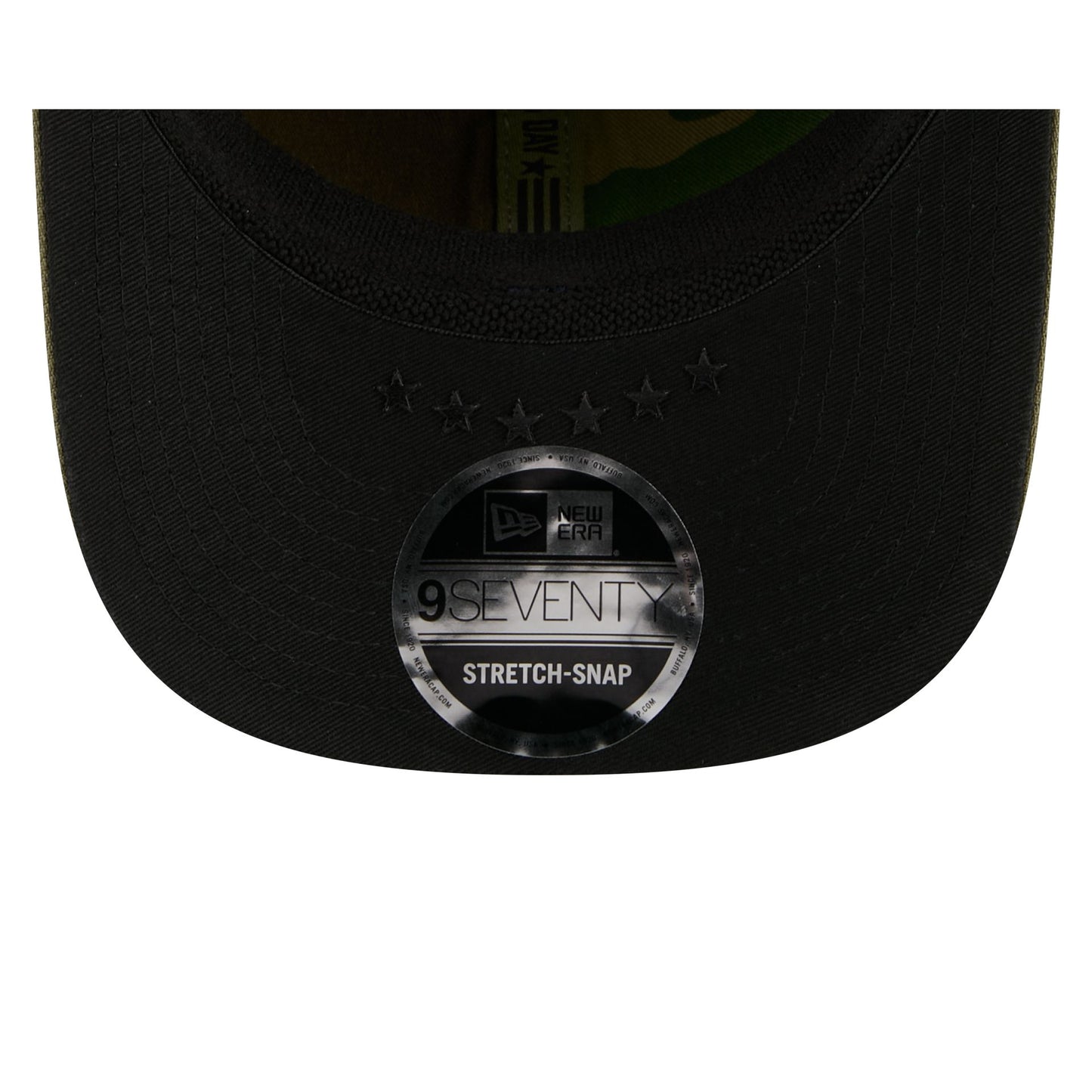 The Boston Red Sox Armed Forces Day 2026 9SEVENTY Stretch-Snap Cap features an embroidered Red Sox patch at the front panels with a matching MLB Batterman logo above a stretch-snap closure at the rear and a screen-printed team wordmark at the visor. Additional details include a heat sealed silicone USA flag patch at the right-wear side with screen-printed stars at a black undervisor and camo patterned interior panels.