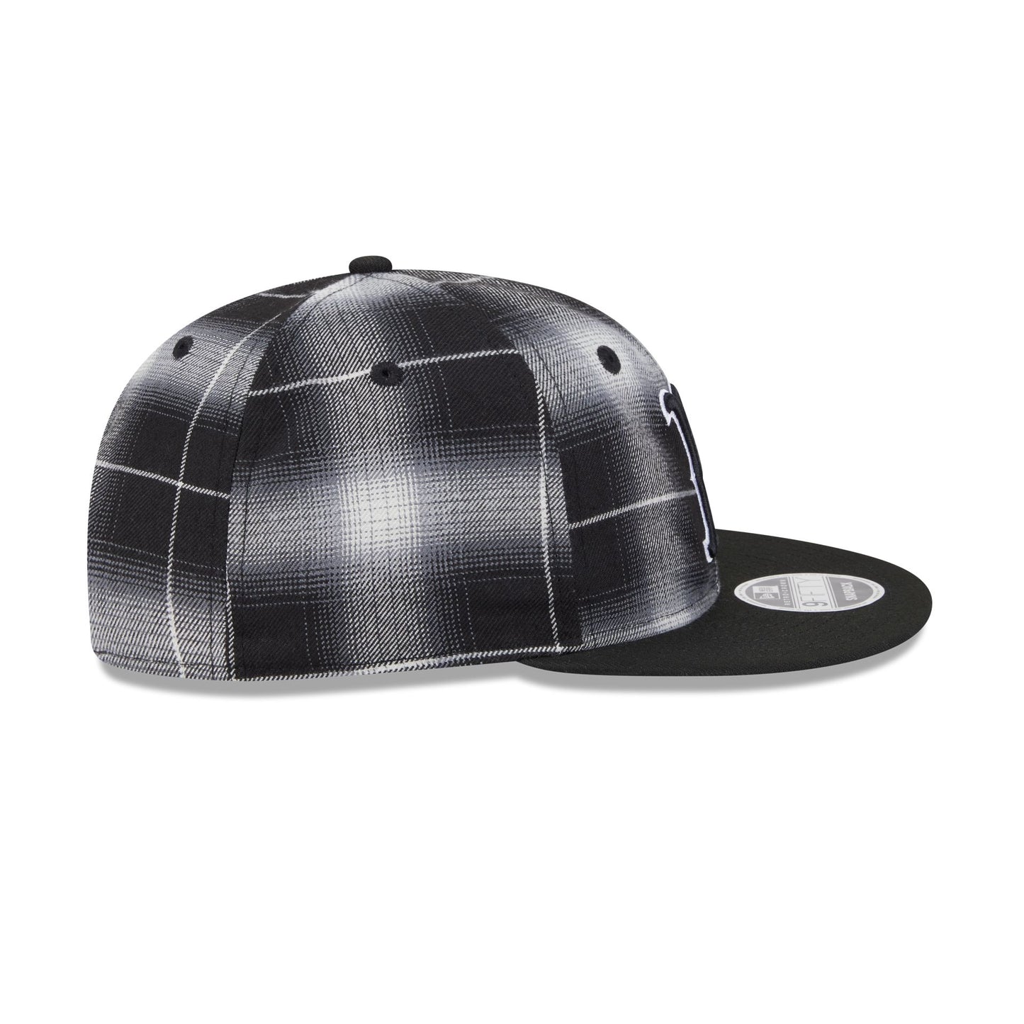 The Boston Red Sox Black and White Plaid Retro Crown 9FIFTY Snapback features an embroidered Red Sox logo at the front panels with a black visor, a gray undervisor, and a snapback closure at the rear.