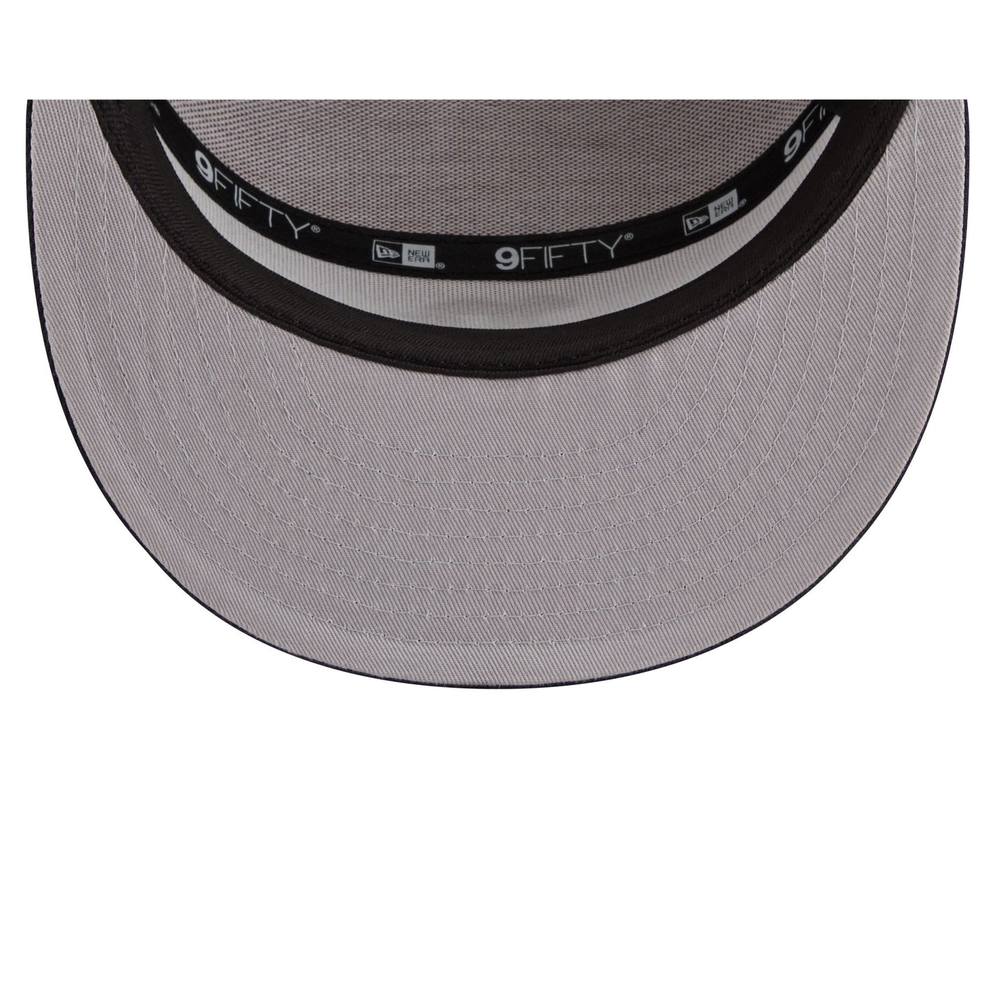 The Boston Red Sox Block Split Panel 9FIFTY Trucker features an embroidered Red Sox logo at the front panels with a split crown construction. Additional details include an adjustable snapback closure at a mesh rear and a gray undervisor.